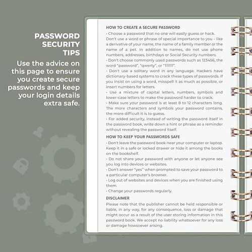 Return Policy Fast Delivery Trusted seller Password Book Spiral – Mini Internet Address & Password Organizer with Laminated Alphabetical Tabs – Small Password Keeper Journal – Hardcover, Pocket Size, 4.7x5.7” (Cypress) Product Description FIND ANY PASSWORD YOU NEED EASILY: Tired of wasting precious time remembering the right password? With Spiral Password Book, you can record up to 440 passwords and organize them alphabetically, so you can find any password you need in no time. TAKE YOUR INTERNET SAFETY TO THE NEXT LEVEL: Every day, hackers come up with new ways to steal valuable data stored digitally. This password keeper book is an effective way to keep your login details offline, so no hacker can ever reach them. Moreover, you can now create unique, complex passwords for each account without risking forgetting them. LAMINATED TABS, SPIRAL BINDING & OTHER FEATURES: This password journal has convenient letter tabs to easily locate any information you need. The tabs are laminated to ensure they withstand daily wear and tear. Durable double wire binding helps you flip the pages effortlessly and write comfortably wver you are. The internet password book with tabs also features a convenient elastic band to keep the pages together, plenty of lined pages to add extra notes, and a back pocket for loose papers. MADE TO LAST WITH PREMIUM-QUALITY MATERIALS: We ensure this password organizer lasts a using only premium-quality materials. The password manager has a soft-touch vegan leather hardcover and thick 120gsm paper that is bleed- and smudge-resistant. The password log book comes in pocket format and measures only 4.7 by 5.7 inches, so you can carry your mini password book in a purse and use it on the go. GUARANTEE & RETURNS – We hope that our small password book with alphabetical tabs will help you store and use your login details efficiently. Otherwise, we will happily exchange or refund your internet address and password logbook if you are having any quality issues or are not completely satisfied with your pasword keeper book for any other reason. Reach out to us via an message for an easy refund of this password notebook with alphabetical tabs. Shipping Returns Payment Shipping Shipping is FREE to all addresses other than APO/PO boxes in the lower 48 states. All our stock ships from US-based warehouses. Shipped via USPS or UPS (depending on location and package weight) Unless stated otherwise, all orders will ship within 24-72 hours of your payment being processed. Check our feedback to see the great reviews of FAST shipping we offer. Returns Seller does not accept returns Payment We currently accept payment via eBay managed payments only. Once payment is cleared, we will dispatch your shipment within 1-3 business days. Please refer to the "Shipping" tab for more information regarding shipping speed to your destination.