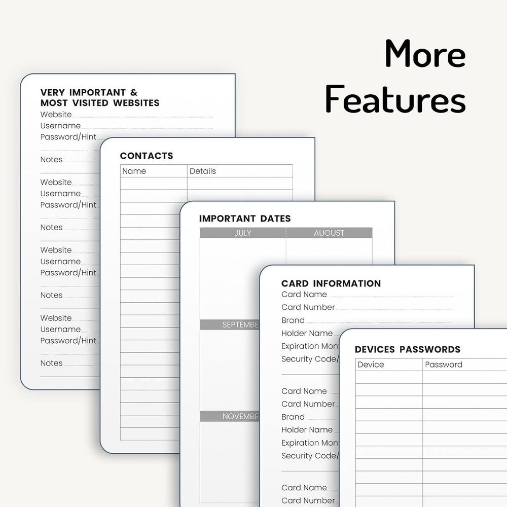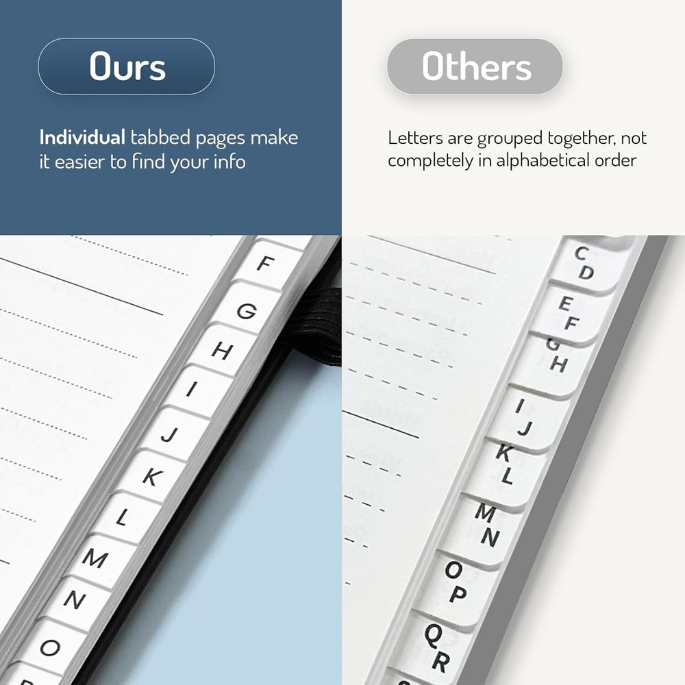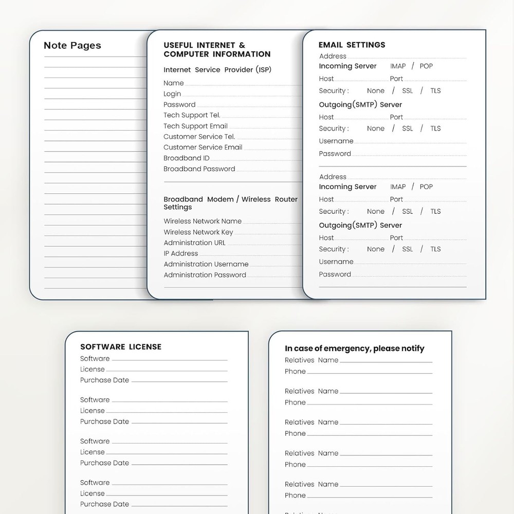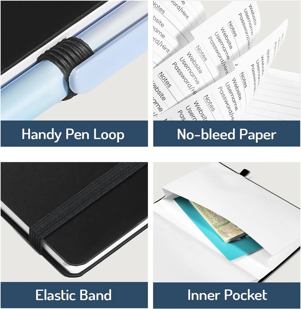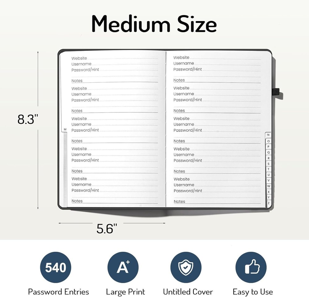 About this item: Individual A-Z Tabs for Quick Access: Say goodbye to the frustration of scrolling through endless entries! This password keeper book boasts individual alphabetical tabs, making it easier to find your login info in no time. It also features an extra tab for your most used websites. Portable & Ample Space: Measuring 5.6"x8.3", this password book fits perfectly into purses or pockets for easy access to your digital world. Stores up to 540 entries and offers spacious writing space. Well-designed layout with larger, easy-to-read type is ideal for seniors. Never Forget Another Password: Bored of hunting for passwords or constantly resetting them? Then this password book is absolutely a lifesaver! Provides a dedicated place to store all of your website addresses, usernames and passwords. Saves you from password forgetting or hackers stealing. It also provides extra pages to record additional information, such as email settings, card info, software license and more. Premium Quality: Adopted thick, no-bleed paper for smooth writing and preventing ink leakage. Plus, the sturdy book bound ensures all your passwords secure. There's also a handy pen loop to ensure your writing tool within reach. Back inner pocket to store your loose notes. Discreet Design for Secretly Secure: With no title on the front to keep your passwords safe from prying eyes, it also offers space to write password hints instead of the password itself! Finished with an elastic band for safe closure, your information is under lock and key.