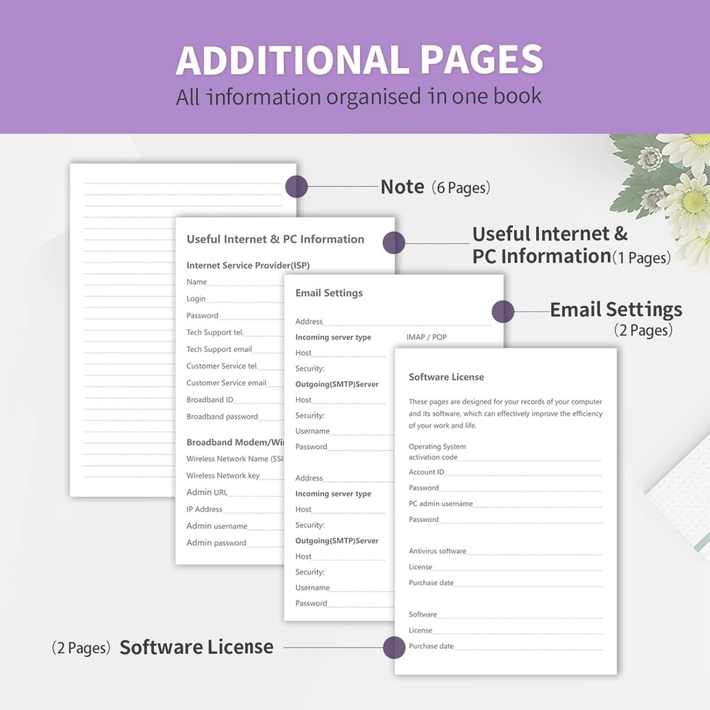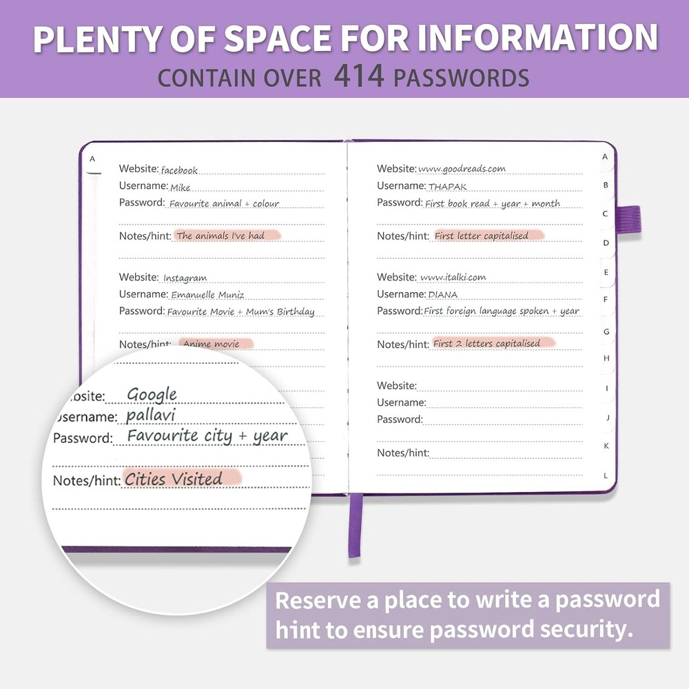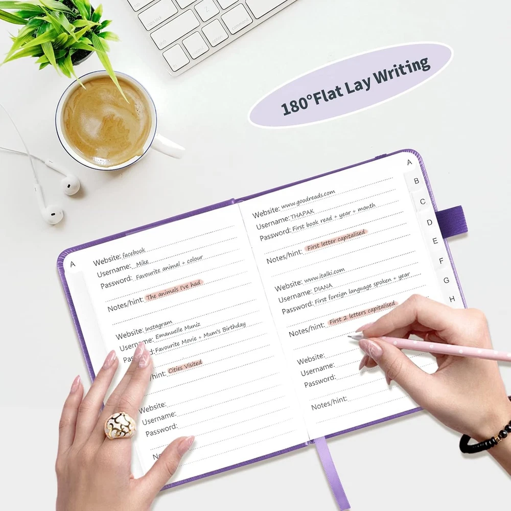 No more Password Aggravation:This book will simplify your electronic life and free you from the constant frustration of trying to remember and reset your passwords. You can record longer and more complex passwords and never forget them again. Alphabetical Tabs (A-Z): We upgraded to one letter one tab(A-Z),others are two letters share 5 pages(AB-YZ). Our password journal has 6 pages per alphabetical tab. Makes your password easy to find and keeps organized. Plenty of Space for Information: Each tab has 6 pages with 3 entries per page, it can contain over 414 passwords. There're additional pages, PC info, email settings and 8 pages of notes. We have reserved a place to write a password hint instead of the password itself to ensure password security. 100GSM No-Bleed Paper: This password notebooks are made of very thick 100gsm paper, no bleed through. Size 4.4in x 5.8in, suitable size for carry-on. 180°lay flat so it’s easy to write in. Excellent Gift to All Ages:Easy to use, keeps passwords organized. With an elastic band, pen holder, bookmarker and inner pocket. A great present for friends and family. Product Description