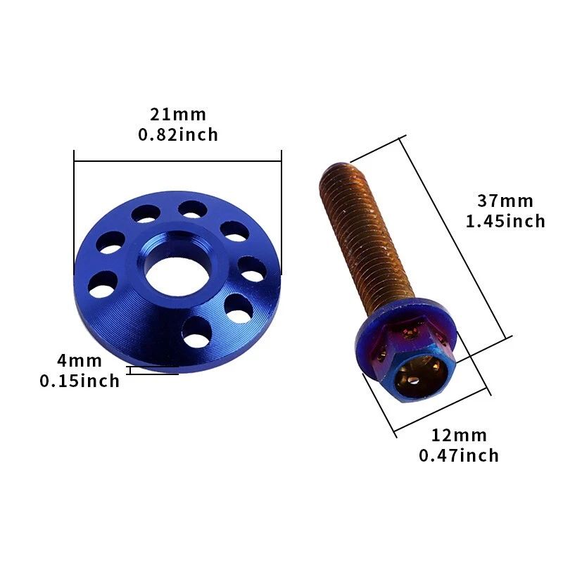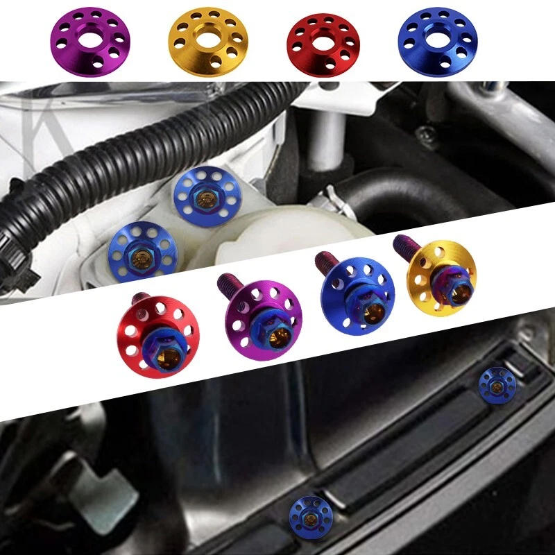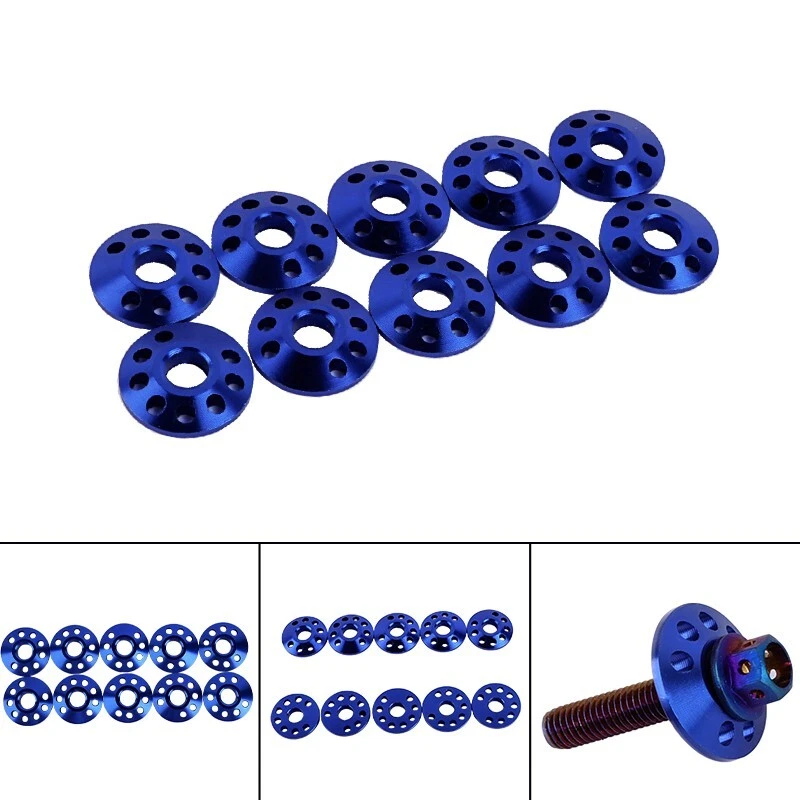 Password JDM Billet Aluminum Blue Engine Bay Dress Up Kit 10 Pieces Fender/Bumper Washer and M6 Burnt Blue Stainless Steel Bolt Set Fits: Acura, Honda, Infinity, Isuzu, Lexus, Mazda, Mitsubishi, Nissan, Suzuki, Subaru, Toyota & More Give your car a more clean and customized Show-Car Look! These Universal washers and M6 bolts will replace any bolt with a 10mm head on any Japanese or European car. The washers are CNC'd from Aluminum and Laser-Etched. Each washer is anodized Blue for long-term color brightness and to prevent oxidation. Popular for headlights, fenders, bumpers and engine parts to give your car that customized edge! It's probably the most inexpensive way of bringing your engine bay to show-level quality. In the bag: M6 x 20mm Burnt Blue Stainless Steel Bolts (10) 18-20mm Blue Aluminum Washer (10) Installation: No instructions or tools are included. Simply remove old bolts and install new M6 bolts with a washer beneath. A hex driver or allen key will be required for installation.