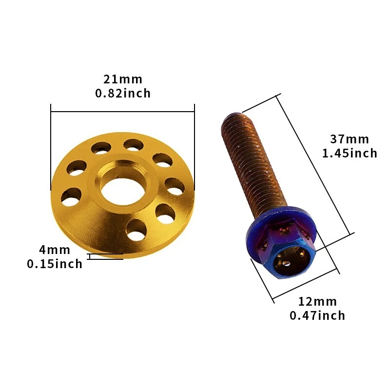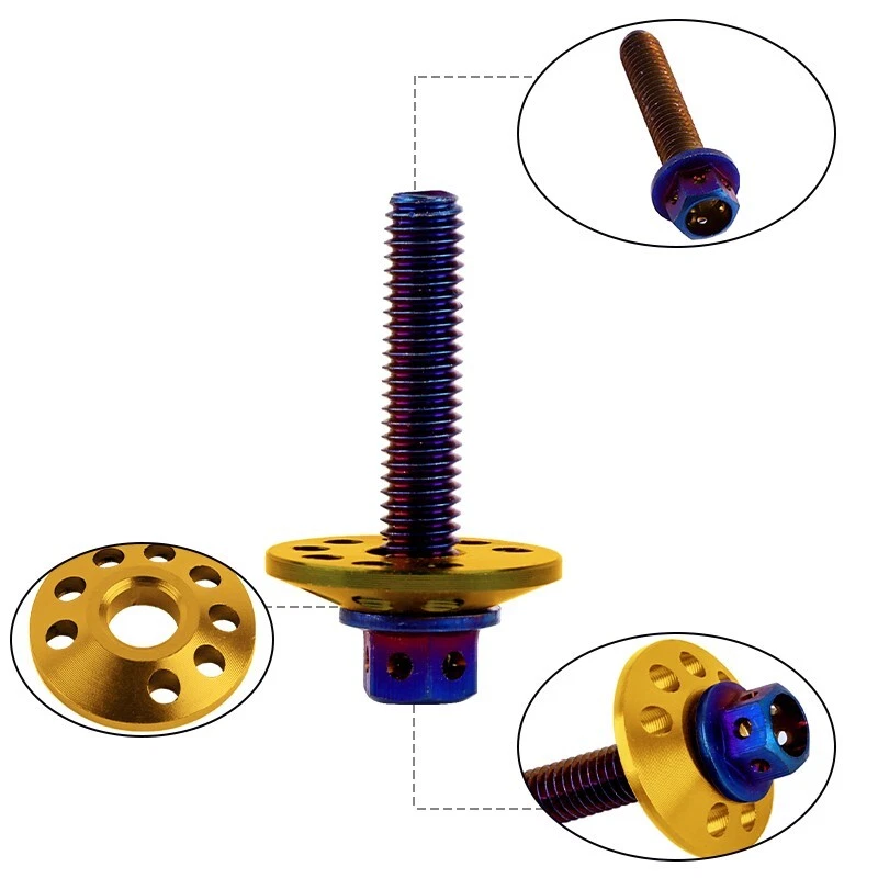 Password JDM Billet Aluminum Glod Engine Bay Dress Up Kit 10 Pieces Fender/Bumper Washer and M6 Burnt Blue Stainless Steel Bolt Set Fits: Acura, Honda, Infinity, Isuzu, Lexus, Mazda, Mitsubishi, Nissan, Suzuki, Subaru, Toyota & More Give your car a more clean and customized Show-Car Look! These Universal washers and M6 bolts will replace any bolt with a 10mm head on any Japanese or European car. The washers are CNC'd from Aluminum and Laser-Etched. Each washer is anodized Glod for long-term color brightness and to prevent oxidation. Popular for headlights, fenders, bumpers and engine parts to give your car that customized edge! It's probably the most inexpensive way of bringing your engine bay to show-level quality. In the bag: M6 x 20mm Burnt Blue Stainless Steel Bolts (10) 18-20mm Glod Aluminum Washer (10) Installation: No instructions or tools are included. Simply remove old bolts and install new M6 bolts with a washer beneath. A hex driver or allen key will be required for installation.