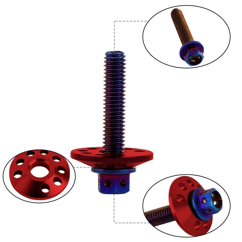 Password JDM Billet Aluminum Red Engine Bay Dress Up Kit 10 Pieces Fender/Bumper Washer and M6 Burnt Blue Stainless Steel Bolt Set Fits: Acura, Honda, Infinity, Isuzu, Lexus, Mazda, Mitsubishi, Nissan, Suzuki, Subaru, Toyota & More Give your car a more clean and customized Show-Car Look! These Universal washers and M6 bolts will replace any bolt with a 10mm head on any Japanese or European car. The washers are CNC'd from Aluminum and Laser-Etched. Each washer is anodized Red for long-term color brightness and to prevent oxidation. Popular for headlights, fenders, bumpers and engine parts to give your car that customized edge! It's probably the most inexpensive way of bringing your engine bay to show-level quality. In the bag: M6 x 20mm Burnt Blue Stainless Steel Bolts (10) 18-20mm Red Aluminum Washer (10) Installation: No instructions or tools are included. Simply remove old bolts and install new M6 bolts with a washer beneath. A hex driver or allen key will be required for installation.