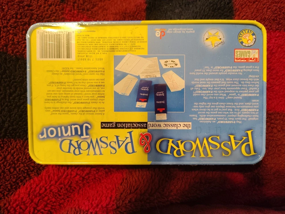 Take your family game nights to a whole new level with this complete word game. It's perfect for two or more players and is great for all ages from 8 to 80! This exciting game, created by Endless Games in 2005, is called Password and Password Junior. The game features a fun and challenging word game that requires you to guess secret words with the help of hints given by your teammate. With a variety of categories such as Brand, Game Type, and Year, this game is sure to keep you entertained for hours. Get ready to test your skills and have a blast with this classic game! Excellent condition almost like new and comes in a sturdy travel tin. From a smoke free, pet free home