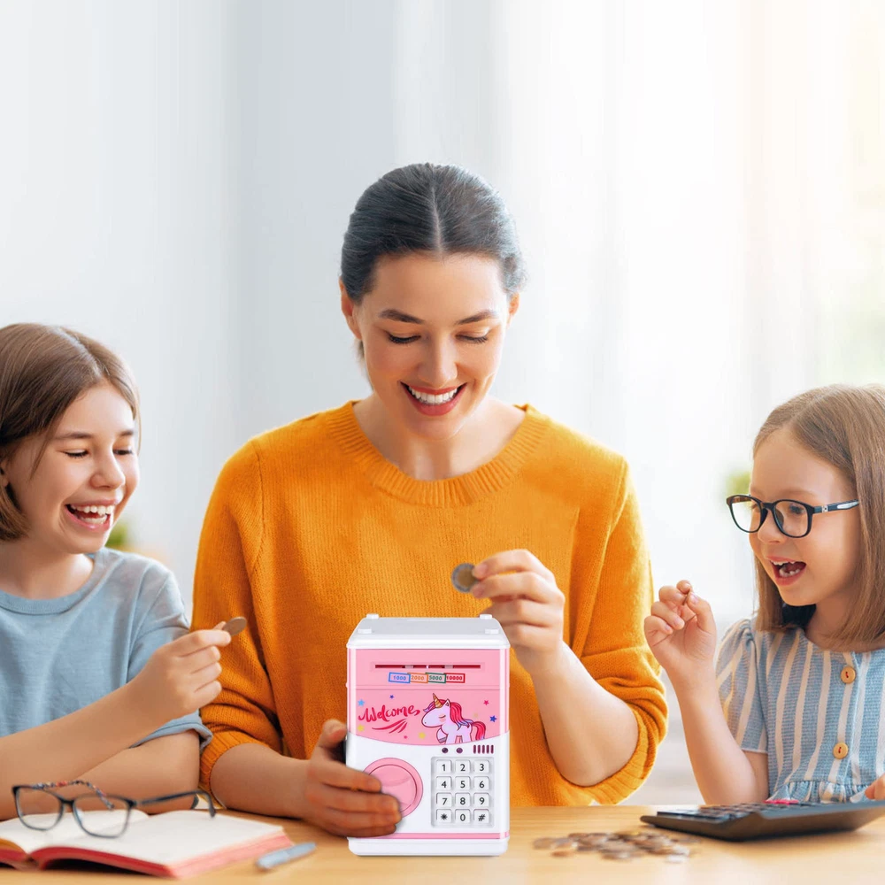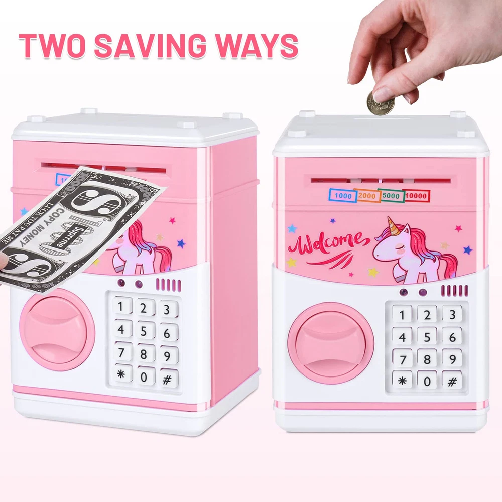【Safe Piggy Bank for 】Our "money safe" box made of ABS plastic, safe design, sturdy and not break easily, passed multiple safety test. Powered by 3 * AA batteries (not included). If you have questions about the product, please us 【High Capacity Money Box】Our this ATM savings bank can 600 pieces of coins or 100 pieces of paper money. It can also small toys, snacks or jewelries and encouraged to start saving money and help them develop a good habit of using money more organized 【Money Saving Way】 ① Put the banknotes on the reel opening of the piggy bank, it will be automatically rolled in; ② There is a coin slot on the top to put coins to save money.(But it doesn't work if the paper is too old or too soft) 【New Unique Cool Piggy Bank】 Our this coin bank and cash bank different with old money bank,it is equipped with 11 popular English children's songs and 4-digit password protection, which make your piggy bank more unique, great birthday and Christmas gift for 3-10 year old 【Best Gift for 】Our this new money saving bank is not only fun, but also have the importance of money saving teaching. Our black piggy bank is the best gift designed for kid age 8+. It is the best holiday gift, daily toy, Christmas gift for your sweetie