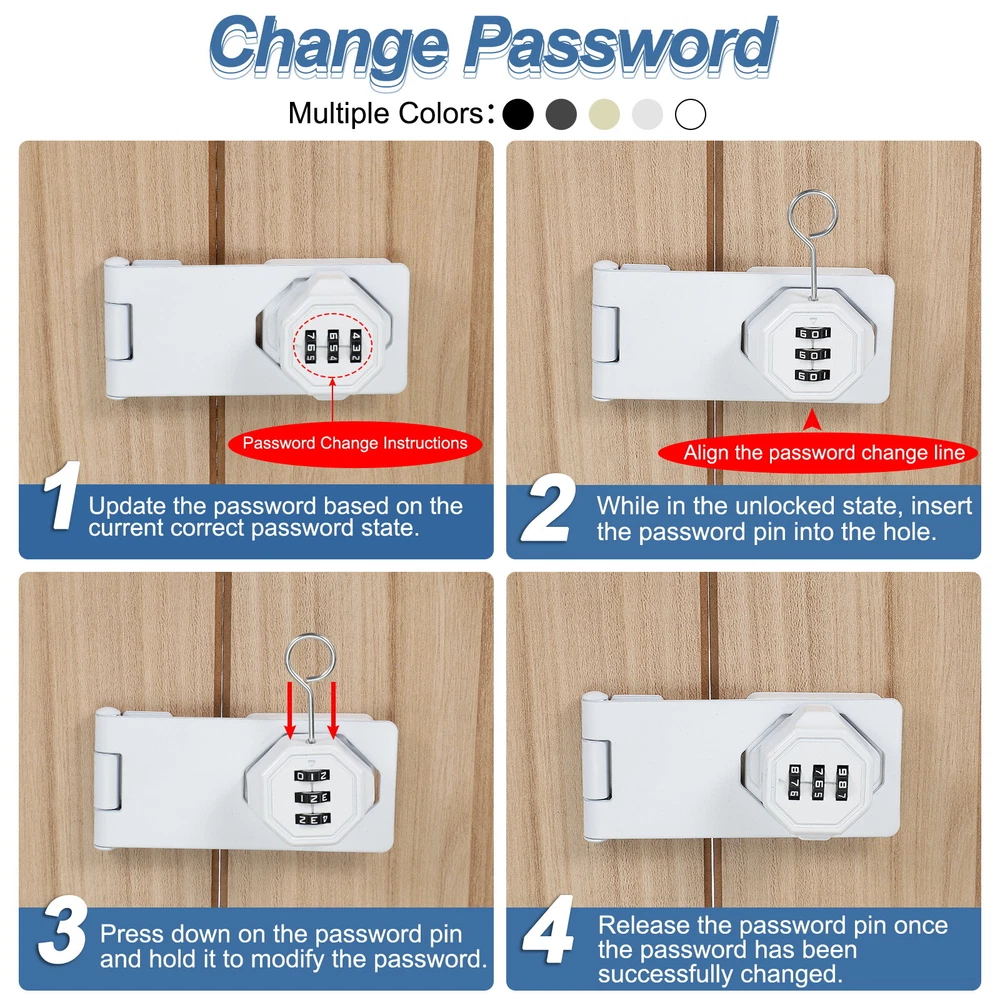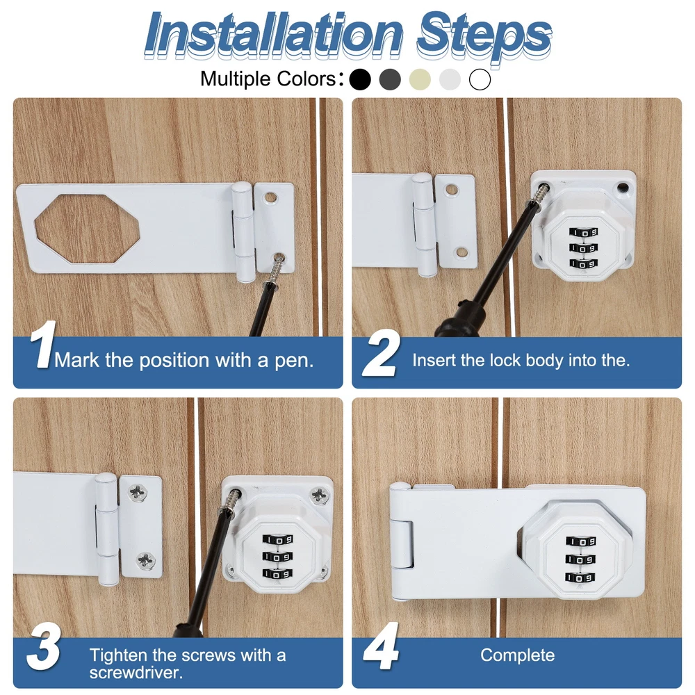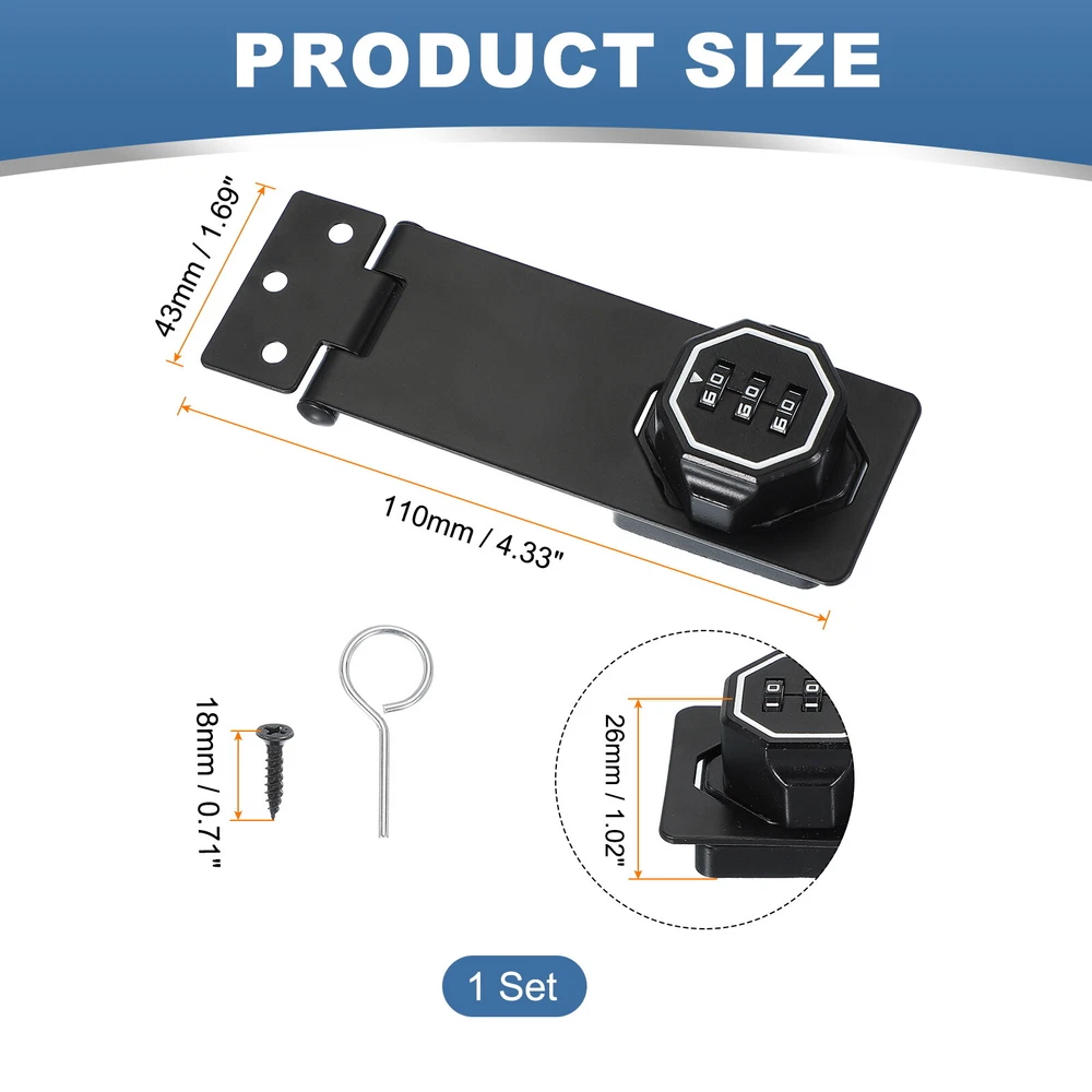 Document What is this?Code rotary hasp locks great use for main doors, sliding doors, sheds, cabins, lockers, windows, cabinets, drawers, kitchens, barn doors, etc.What will I get?The Bifold Door Lock Sizes: 110 x 43 x 26 mm / 4.33 x 1.69 x 1.02 Inch (L*W*H), Screw Length: 18 mm / 0.7 Inch.In the package of: 1 x Closet Lock, 7 x Screw, 1 x Password PinIs there any advantages of the product?Cabinet locks are made of zinc alloy and the surface is electroplated and polished, with a thickened base, corrosion-resistant, have smooth edges, and turn smoothly without jamming. Keyless design, and can be used for a long time, no longer need to worry about losing your key.How to use it?The door latch lock can be installed at a right angle of 90 degrees or a flat surface of 180 degrees, the password can be set or modified when the lock is in the unlocked state.What should I notice?The initial password is 000. (Refer to the manual for use) Password Rotary Hasp Locks Mechanical Cabinet Latch Locks 5" No Drilling Black What is this? Code rotary hasp locks great use for main doors, sliding doors, sheds, cabins, lockers, windows, cabinets, drawers, kitchens, barn doors, etc. What will I get? The Bifold Door Lock Sizes: 110 x 43 x 26 mm / 4.33 x 1.69 x 1.02 Inch (L*W*H), Screw Length: 18 mm / 0.7 Inch. In the package of: 1 x Closet Lock, 7 x Screw, 1 x Password Pin Is there any advantages of the product? Cabinet locks are made of zinc alloy and the surface is electroplated and polished, with a thickened base, corrosion-resistant, have smooth edges, and turn smoothly without jamming. Keyless design, and can be used for a long time, no longer need to worry about losing your key. How to use it? The door latch lock can be installed at a right angle of 90 degrees or a flat surface of 180 degrees, the password can be set or modified when the lock is in the unlocked state. What should I notice? The initial password is 000. (Refer to the manual for use) Hot Item Payment 1.We accept eBay payment . 2.Payment must be received within 7 business days of auction closing. Shipping 1.We ship to your eBay or Paypal address. Please make sure your eBay and Paypal address is correct before you pay. 2.Items will be shipped within 1-3 business day when we received payment. 3.Delivery time depends on destination and other factors. Description Policy Password Rotary Hasp Locks Mechanical Cabinet Latch Locks 5" No Drilling Black What is this? Code rotary hasp locks great use for main doors, sliding doors, sheds, cabins, lockers, windows, cabinets, drawers, kitchens, barn doors, etc. What will I get? The Bifold Door Lock Sizes: 110 x 43 x 26 mm / 4.33 x 1.69 x 1.02 Inch (L*W*H), Screw Length: 18 mm / 0.7 Inch. In the package of: 1 x Closet Lock, 7 x Screw, 1 x Password Pin Is there any advantages of the product? Cabinet locks are made of zinc alloy and the surface is electroplated and polished, with a thickened base, corrosion-resistant, have smooth edges, and turn smoothly without jamming. Keyless design, and can be used for a long time, no longer need to worry about losing your key. How to use it? The door latch lock can be installed at a right angle of 90 degrees or a flat surface of 180 degrees, the password can be set or modified when the lock is in the unlocked state. What should I notice? The initial password is 000. (Refer to the manual for use) Hot Item Payment 1.We accept eBay payment . 2.Payment must be received within 7 business days of auction closing. Shipping 1.We ship to your eBay or Paypal address. Please make sure your eBay and Paypal address is correct before you pay. 2.Items will be shipped within 1-3 business day when we received payment. 3.Delivery time depends on destination and other factors.