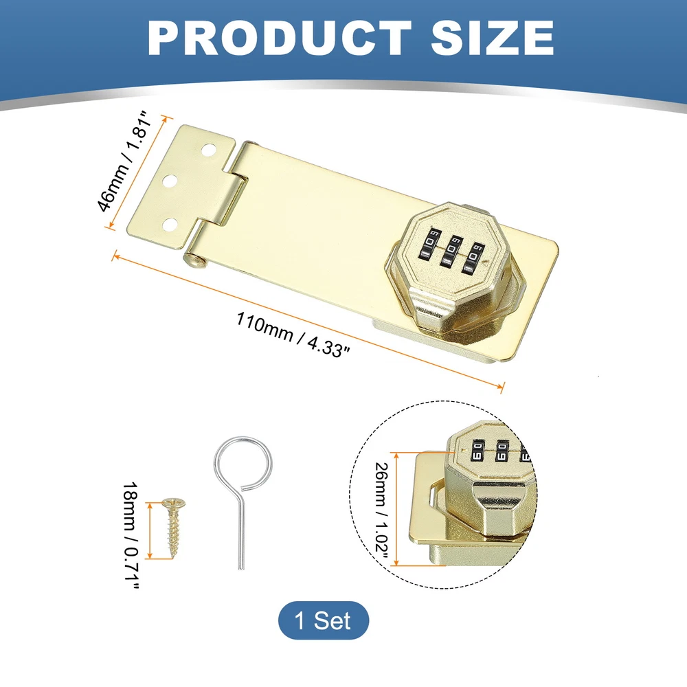 Document What is this?Code rotary hasp locks great use for main doors, sliding doors, sheds, cabins, lockers, windows, cabinets, drawers, kitchens, barn doors, etc.What will I get?The Bifold Door Lock Sizes: 110 x 46 x 26 mm / 4.33 x 1.81 x 1.02 Inch (L*W*H), Screw Length: 18 mm / 0.7 Inch.In the package of: 1 x Closet Lock, 7 x Screw, 1 x Password PinIs there any advantages of the product?Cabinet locks are made of zinc alloy and the surface is electroplated and polished, with a thickened base, corrosion-resistant, have smooth edges, and turn smoothly without jamming. Keyless design, and can be used for a long time, no longer need to worry about losing your key.How to use it?The door latch lock can be installed at a right angle of 90 degrees or a flat surface of 180 degrees, the password can be set or modified when the lock is in the unlocked state.What should I notice?The initial password is 000. (Refer to the manual for use) Password Rotary Hasp Locks Mechanical Cabinet Latch Locks 5" No Drilling Gold What is this? Code rotary hasp locks great use for main doors, sliding doors, sheds, cabins, lockers, windows, cabinets, drawers, kitchens, barn doors, etc. What will I get? The Bifold Door Lock Sizes: 110 x 46 x 26 mm / 4.33 x 1.81 x 1.02 Inch (L*W*H), Screw Length: 18 mm / 0.7 Inch. In the package of: 1 x Closet Lock, 7 x Screw, 1 x Password Pin Is there any advantages of the product? Cabinet locks are made of zinc alloy and the surface is electroplated and polished, with a thickened base, corrosion-resistant, have smooth edges, and turn smoothly without jamming. Keyless design, and can be used for a long time, no longer need to worry about losing your key. How to use it? The door latch lock can be installed at a right angle of 90 degrees or a flat surface of 180 degrees, the password can be set or modified when the lock is in the unlocked state. What should I notice? The initial password is 000. (Refer to the manual for use) Hot Item Payment 1.We accept eBay payment . 2.Payment must be received within 7 business days of auction closing. Shipping 1.We ship to your eBay or Paypal address. Please make sure your eBay and Paypal address is correct before you pay. 2.Items will be shipped within 1-3 business day when we received payment. 3.Delivery time depends on destination and other factors. Description Policy Password Rotary Hasp Locks Mechanical Cabinet Latch Locks 5" No Drilling Gold What is this? Code rotary hasp locks great use for main doors, sliding doors, sheds, cabins, lockers, windows, cabinets, drawers, kitchens, barn doors, etc. What will I get? The Bifold Door Lock Sizes: 110 x 46 x 26 mm / 4.33 x 1.81 x 1.02 Inch (L*W*H), Screw Length: 18 mm / 0.7 Inch. In the package of: 1 x Closet Lock, 7 x Screw, 1 x Password Pin Is there any advantages of the product? Cabinet locks are made of zinc alloy and the surface is electroplated and polished, with a thickened base, corrosion-resistant, have smooth edges, and turn smoothly without jamming. Keyless design, and can be used for a long time, no longer need to worry about losing your key. How to use it? The door latch lock can be installed at a right angle of 90 degrees or a flat surface of 180 degrees, the password can be set or modified when the lock is in the unlocked state. What should I notice? The initial password is 000. (Refer to the manual for use) Hot Item Payment 1.We accept eBay payment . 2.Payment must be received within 7 business days of auction closing. Shipping 1.We ship to your eBay or Paypal address. Please make sure your eBay and Paypal address is correct before you pay. 2.Items will be shipped within 1-3 business day when we received payment. 3.Delivery time depends on destination and other factors.