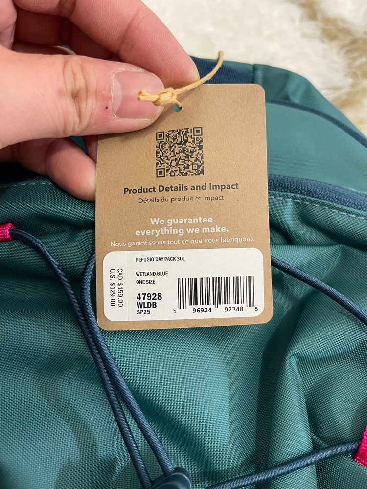 Brand new with tag 100% authentic All sales are final, pleae make sure it's the right size before ordering Fast shipping via UPS Ground Made of 100% Recycled Polyester To resist light moisture, this 30-liter pack is treated with a durable water repellent (DWR) finish made without intentionally added PFAS; all fabrics are 100% recycled polyester except the stretchy mesh for the side pockets, which is a 72% recycled nylon/28% spandex blend Padded 15" Laptop Sleeve Removable padded sleeve fits laptops up to 15" and has two drop-in pockets and a secure zippered pocket to hold pens, cords and other desktop items to ease transitions from work to play Breathable Back Panel and Hydration Hanger Hydration hanger, pass-through access and a breathable back panel are as ready for the trail as the daily commute Tech-Friendly Features and Organization Dedicated Desk Caddy compartment, the largest main compartment in the Refugio lineup, a zip-secure top accessory pocket and an external bungee cord for lashing help keep your day organized and frequently used items close at hand Bike Light Clip Bike-light clipping point at the base of the pack 19" Torso Length 19" torso length fits most adults (the “Refugio Fit”) Supporting the People Who Made This Product Made in a Fair Trade Certified™ factory, which means the people who made this product earned a premium for their labor Country of Origin Made in Vietnam. Weight 795 g (1 lb 12 oz)
