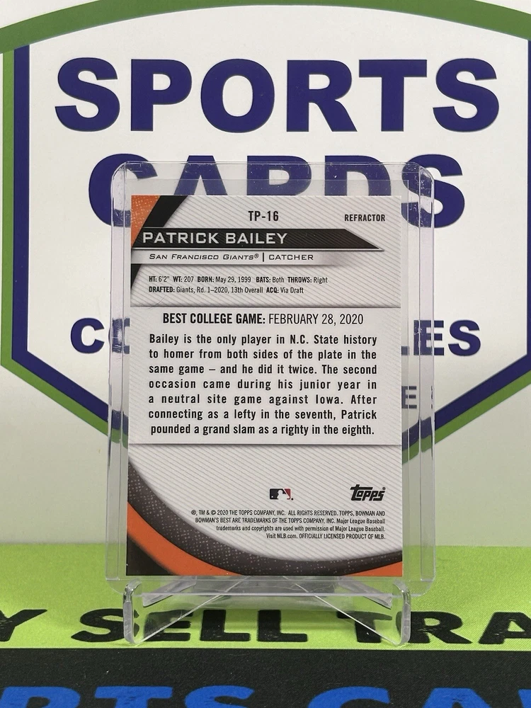 Up for bids is a Patrick Bailey 2020 Bowman’s Best Baseball Top Prospect card. This card is in near mint condition and is ready for any collection. Cards will be shipped out in a penny sleeve and top loader. Free shipping and happy bidding.