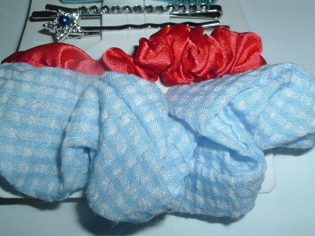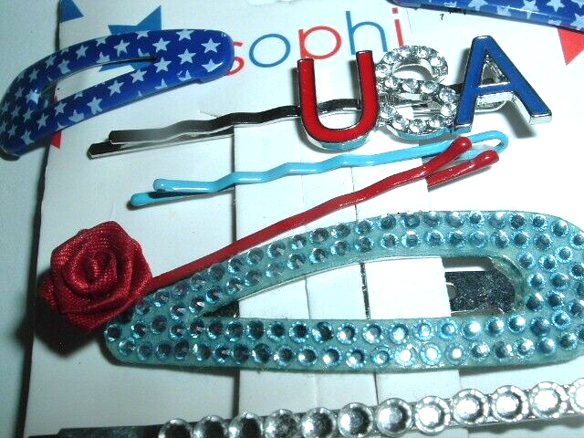A patriotic set of red, white and blue hair clips, jeweled bobby pins and ponytail scrunchies all new.