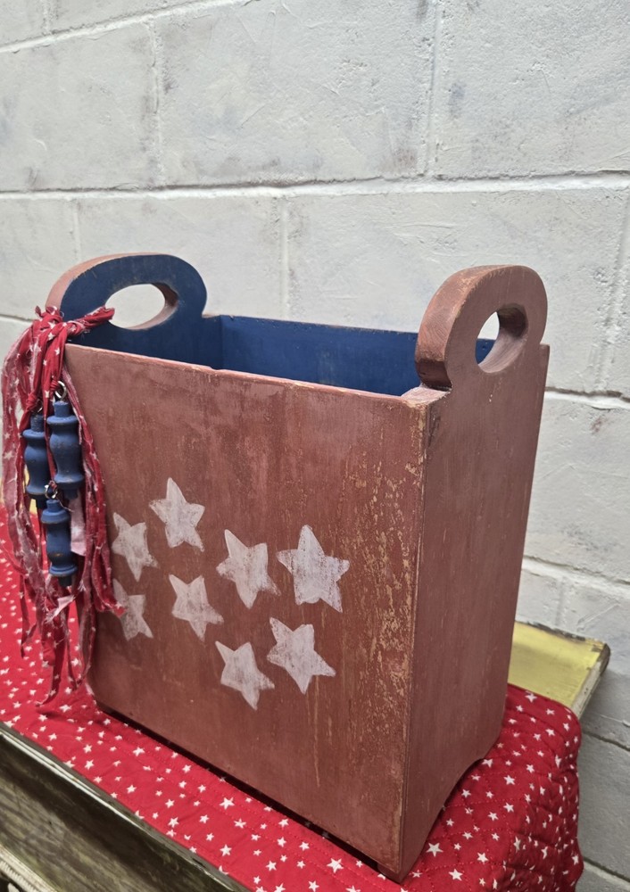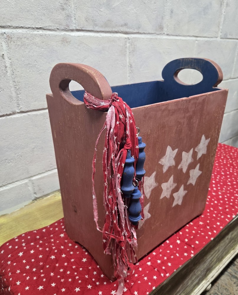 The Wood Americana 4th of July Storage Tote with Wood tassels is a rustic and primitive-style tote made of wood. Perfect for storage or displaying small items, this tote features decorative wood tassels and is ideal for adding a touch of Americana to your home decor. Made with quality materials, this unique and stylish piece is sure to be a conversation starter in any room. Painted with milk paint and sealed. 16 tall. 13 length, 7 wide