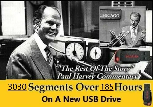 Original Old Time Radio Legend Paul Harvey 3030 Episodes from my private collection in mp3 format on USB Flash Drive Over 185 Hours of play time Your order will be shipped the next day USPS First Class With a tracking Number . Does not require internet or Bluetooth. This is a "plug and play" device. Compatible with all cars, computers, and other devices with a USB port that play audio files. NOTE: Please realize these are old recordings that are not going to be the same as today’s digital recordings. Some portions may be missing or may have pops, clicks or hiss. Levels may be a bit lower but overall quality is good but remember these are old radio shows. We use the best quality components. All of our files are free of commercials, except the authentic vintage commercials contained in the old radio programs. The Rest of the Story was a Monday-through-Friday radio program originally hosted by Paul Harvey . Beginning as a part of his newscasts during the Second world war and then premiering as its own series on the ABC Radio Networks on May 10, 1976, The Rest of the Story consisted of stories presented as little-known or forgotten facts on a variety of subjects with some key element of the story (usually the name of some well-known person) held back until the end. The broadcasts always concluded with a variation on the tag line, "And now you know...the rest of the story." On the majority of radio stations, it often served as a mid-afternoon drive counterpart to Harvey's noontime News and Comment . From its inception, the scripts for the series had been drafted and the broadcasts produced by Harvey's son Paul Harvey jr . , who in later years of his father's career also acted as a substitute host. Some of the radio stories were published in book form as The Rest of the Story and More of The Rest of the Story . (On the back cover of More of the Rest of the Story , the book is said to contain "True mysteries from history".) After the elder Harvey's death on February 28, 2009, ABC radio host Doug Limerick was chosen as the show's new host. The Rest of the Story was canceled after three weeks with Limerick as host.