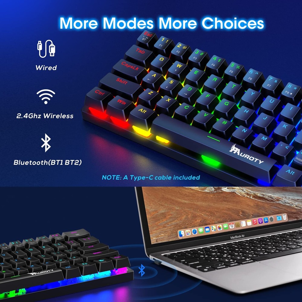 Pauroty 60% Wireless Mechanical Keyboard, Triple Mode 2.4G/USB-C/Bluetooth Gaming Keyboard, RGB Backlit, Clicky Blue Switch, 61 Keys Rechargeable Mini Wireless Keyboard for iPad Mac PC Xbox Product Details Color: Black Brand: Pauroty MPN: PC335 UPC: 652261256483 EAN: 0652261256483 Brand: Pauroty Compatible Devices: PC, iPad, Xbox, ipad, Mac Connectivity Technology: Bluetooth Keyboard Description: Gaming Recommended Uses For Product: Multimedia, Everyday Use, Personal, Education, Photo Editing, Student, Gaming, Business Special Feature: Mini, Waterproof, Backlit, 60 percent keyboard, Rechargeable Color: Black Number of Keys: 61 Keyboard backlighting color support: RGB Style: Classic Product Dimensions: 12.2 x 5.43 x 1.65 inches Item Weight: 1.21 pounds Manufacturer: ELTZ Language: English Item model number: PC335 Date First Available: November 24, 2021 More Connection Options: Supporting both wired and wireless connections, this wireless gaming keyboard can be connected to your PC, laptop, iPad, phone, and more through the 2.4G USB receiver or BT1/BT2 Bluetooth modes. You can also simultaneously charge and play using the included Type-C data cable. 60% Compact, 100% Portable: By eliminating the numeric keypad, function key row, and navigation cluster, this 60 percent keyboard becomes ultra-compact, saving space on your desk and leaving more room for mouse movement. It easily fits into most backpacks for superb portability when you're on the go. Immersive RGB Brilliance: Equipped with 16 RGB backlight modes, 8 color choices, 6 brightness levels, and per-key customization, this RGB 60% percent keyboard maximizes your gaming ambiance. And if you prefer, you can turn off the lights to save power. Stronger Battery Life: This bluetooth keyboard features a built-in 1600mAh rechargeable battery, with 360 hours of standby time and over 10 hours of continuous usage on a full charge. It includes a power switch and a 10-minute sleep mode to conserve energy. The included Type-C data cable fully charges it in just a few hours. Swift Response with Blue Switch: Utilizing the classic blue switch, this wireless keyboard offers rapid response, zero latency, and delightful tactile feedback with each keystroke. The stepped layout and foldable stand also provide an ergonomic angle for comfortable typing.