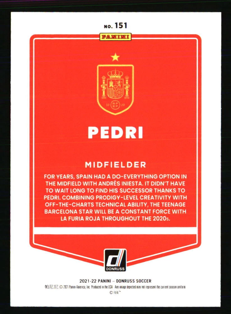 Season: 2021 Autographed: No Year Manufactured: 2021 Manufacturer: Donruss Graded: No Player|Athlete: Pedri Type: Sports Trading Card Set: 2021-22 Donruss Team: Spain Sport: SOCCER Card Number: 151