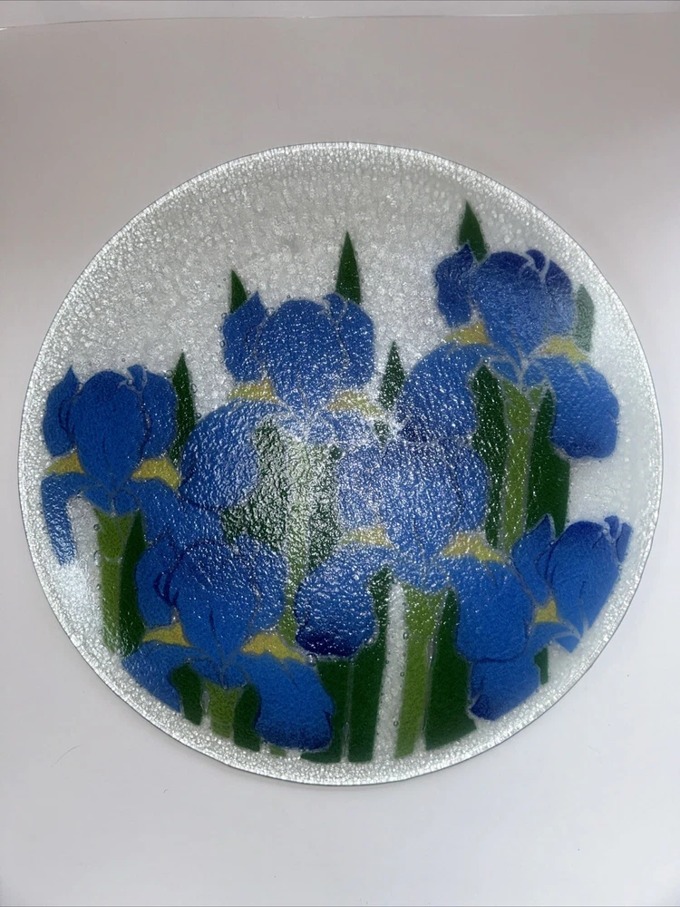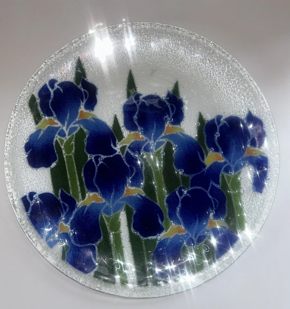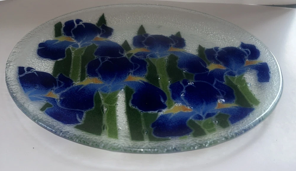 This beautiful round plate/tray by Peggy Karr features a stunning blue flower iris design, handmade with high-quality fused glass materials. The plate has a diameter of 13.5 inches and is perfect for serving your favorite dishes. The contemporary style and multi-color pattern make it a great addition to any collection. This plate is signed by the artist and is a one-of-a-kind piece. It's perfect for those who appreciate unique, handmade items. Add this beautiful iris platter to your decorative cookware, dinnerware, and serveware collection today! kk383