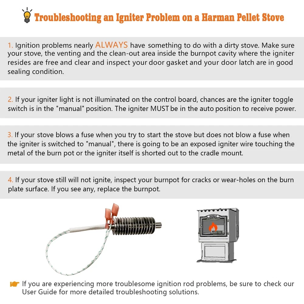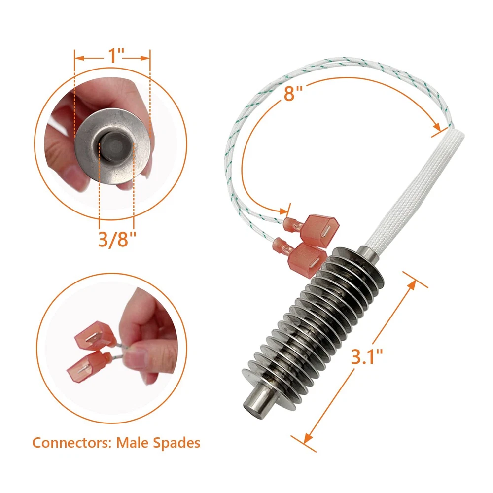 TROUBLESHOOTING FOR HARMAN PELLET STOVE IGNITER: If your stove blows a fuse when you try to start the stove but does not blow a fuse when the igniter parts is switched to "manual", there is going to be an exposed igniter wire touching the metal of the burn pot or the ignition rod itself is shorted out to the cradle mount HELPFUL TIPS: This 306 Watt ignitor is compatible with all automatic ignition Harman except those which use a pressurized ignition system. Replacement Part Models: 3-20-677200, 3-20-06783, 1-10-06620 REPLACEMENT KIT FOR HARMAN STOVE PARTS IGNITER: Compatible with Harman Models: Absolute 43, Absolute 43-C, Absolute 63, Accentra, 52i, 52i TC, Accentra Cast Free Standing, Accentra Insert, Advance, Allure 50, P35i, P35i-C, P43, P43-C, P61, P61-C, P61A, P68, P68-C, PB105 (Pre: 008341121), Furnace & Boiler Systems, PF100 (Pre: 008350087), XXV, XXV TC HAVE WARMTH THIS WINTER: 306 W 120 V pellet stove igniter made from durable materials and guaranteed to provide a perfect fit. The metal part of the ignitor is 3.1" and the wire lead is 8",male spades connectors are easy to install, which can help you to keep infusing family with warmthin this season SERVICE: If you encounter any problems during the installation and use, please do not hesitate to contact us. We have a professional after-sales team that will provide you with the most effective solution within 24 hours