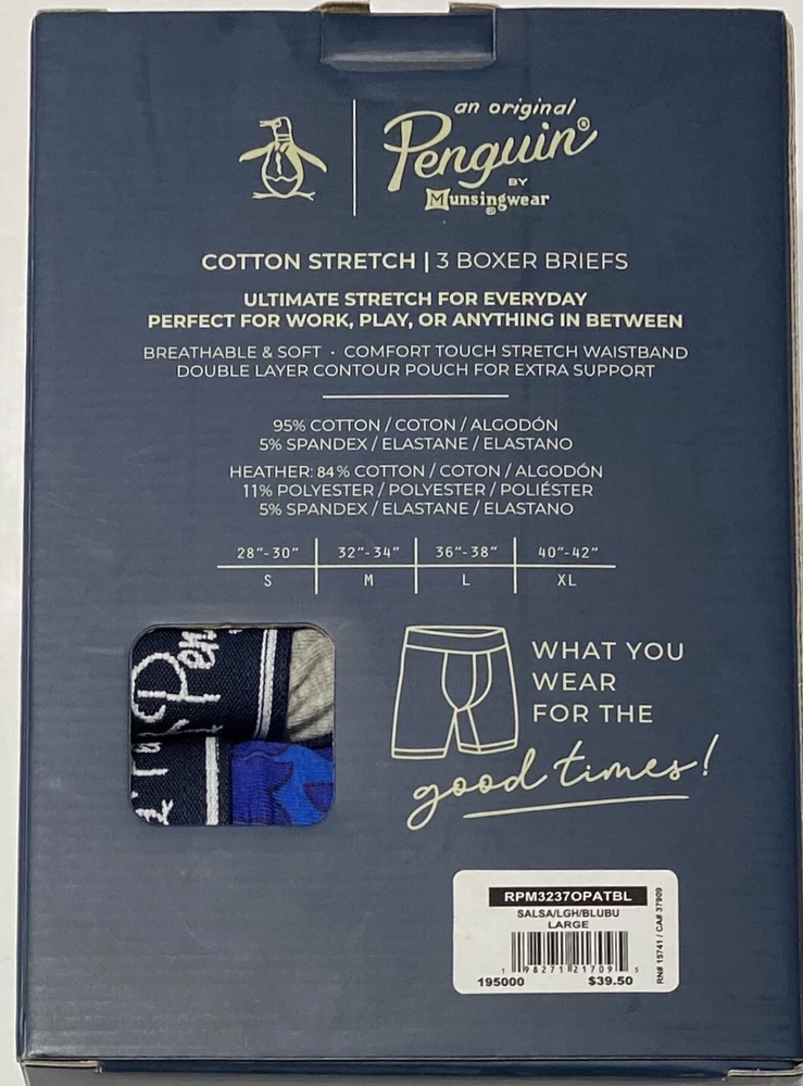 Color: Multicolor Number in Pack: 3 MPN: xxxx UPC: 198271217095 Material: Cotton Blend Brand: Penguin Model: xxxxxx Department: Men Size Type: Regular gtin13: 198271217095 Style: Boxer Brief Size: L Features: Stretch Type: Underwear