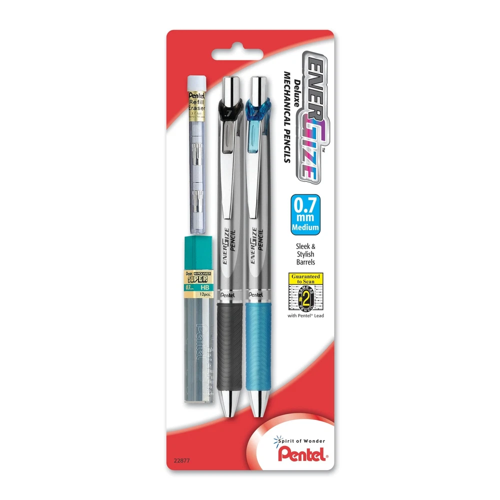 Beyond the next generation - Matching design with EnerGel Deluxe RTX Gel Pen. Stylish automatic pencil with sleek barrel and textured, latex-free comfort grip. 0.7mm lead produces crisp, medium lines of consistent density. Pentel Super Hi-Polymer Lead never needs sharpening and is equivalent to a #2 pencil. Refillable with Pentel Super Hi-Polymer Lead and Z2-1 refill eraser. Side-advance button quickly advances lead for a seamless writing experience. Slider extends and retracts the included latex-free eraser. Eraser resists smudging and helps prevent paper tears. Rubberized grip for enhanced comfort. Preloaded with Pentel Super Hi-Polymer HB lead. Backed by the manufacturer's limited lifetime warranty.