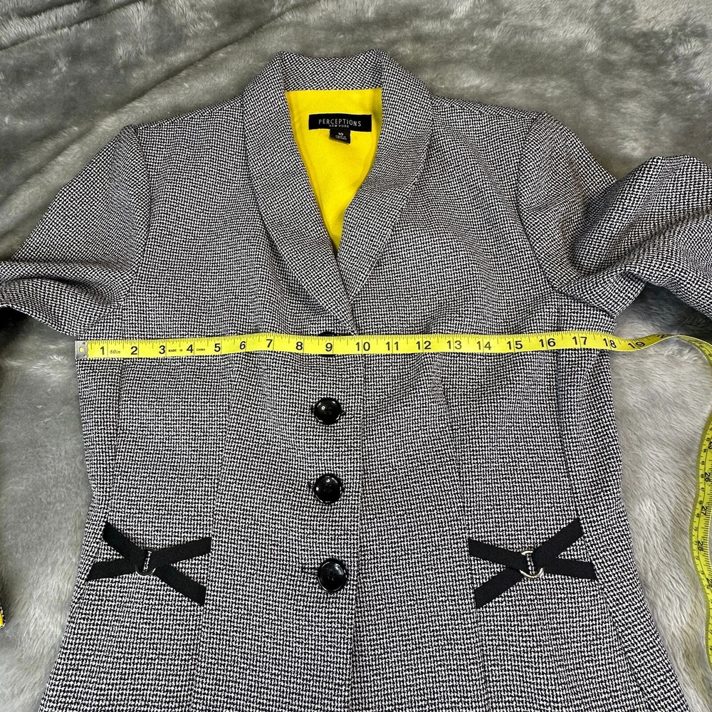 Perceptions Women's Size 10 Black White Long Sleeve Button Front Blazer Jacket Gender: Womens Size: 10 Brand: Perceptions Color: Black and White with Yellow accent Long Sleeves 4 Button Front V-Neck Collared Decorative X's on Front and Back Yellow Accent on Neck and Cuffs 100% Polyester Machine Washable Made in Vietnam Approximate Measurements Not Exact: Underarm to Underarm Approx. - 18” Length Approx. - 24" Pre-Owned in Excellent Condition (EUC) *Colors may vary depending on lighting and individual viewing devices Offers Welcomed Bundle Discounts Available Fast Shipping 5 Star Seller Thank you for shopping my closet! Location 19 - 0007 Professional, Business, WorkWear, Office Wear, Jacket, Blazer, Coat, Lightweight, Sophisticated, Suit, CorpCore, Classic, ClassicCore, Basic, Mature, Sophisticated