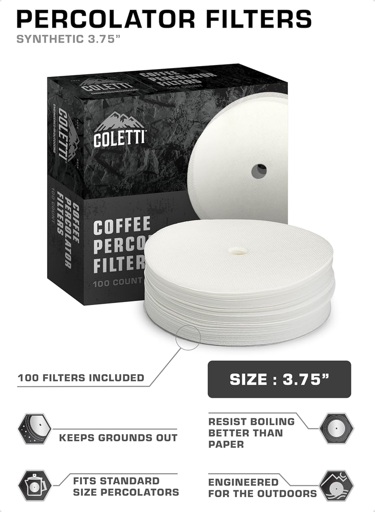Store New Arrivals Add to Favorite View Feedback Contact Percolator Coffee Filters — Disc Coffee Filters for Percolators – for Bozeman, Butte, & Scoutmaster Camping Coffee Pot – Medical Grade Fiber, Perfectly Tasteless [100 Pack, Synthetic, 3.75”] Description Item model number BOZEMAN-BF Unit Count 100 Count Material Synthetic Material Type Synthetic Item Weight 1.41 ounces Shape Disk Number of Pieces 100 Is Discontinued By Manufacturer No Product Dimensions 4.4 x 4.3 x 1.3 inches Size 3.75" COMPATIBLE WITH: COLETTI, Stransport, Eurolux, Primula, Mereza, & More Percolators BETTER TASTING: Your brew deserves the best disc coffee filter for percolators. We put care into finding the best materials for all our percolator filters, that way your coffee can taste the way it’s supposed to PREMIUM PERCOLATOR FILTERS: Percolator coffee should taste bold, robust, & full flavored. Filters for percolators should never leave a hint of a paper flavor in your coffee, we believe in great coffee with no compromises across our whole catalog MADE FOR CAMPERS: COLETTI is a camping brand through-n-through. A camping coffee filter should represent our collective values as nature lovers, our percolator filters pack light and are completely disposable PERFECT FIT: The ideal percolator coffee pot filter / percolator coffee filters with hole. Use with COLETTI products or whatever percolator you have at home. A perfect brew starts with exceptional equipment PACK OF 100 WHITE: 3.75” SYNTHETIC filter disc. Large percolator filter, fits all coffee percolator sizes and styles. Use with the COLETTI Bozeman percolator for the best brewing experience Product Description ABOUT US We offer the best prices around on high quality products. Our E-store includes media such as books, movies, music and games while offering electronics, toys, sporting apparel, clothing, tools, general home, garden items and more. SHIPPING We are always working hard to ensure your package arrives as soon as possible. Please understand that some factors like weather, high postal traffic, and the performance of shipping companies are outside of our control. We offer free shipping to the lower 48 states and ship within 2 business days of payment, usually sooner. We do not accept P.O. Boxes. Please provide a physical address. RETURNS We offer a 30-Day Return Policy on items which you are not completely satisfied with. You have the option for a full-refund or an exchange of the item. No returns are available on items shipped outside of the USA. PAYMENT We accept PayPal. CONTACT US This page content is yet to come Please ad us to your favorite seller and visit again later Thank You CUSTOMER SATISFACTION We try our very best to make sure every customer is completely satisfied. If there's a problem, message us! We're happy to help