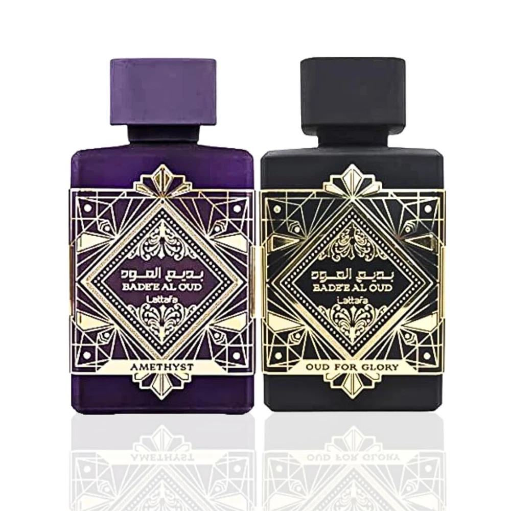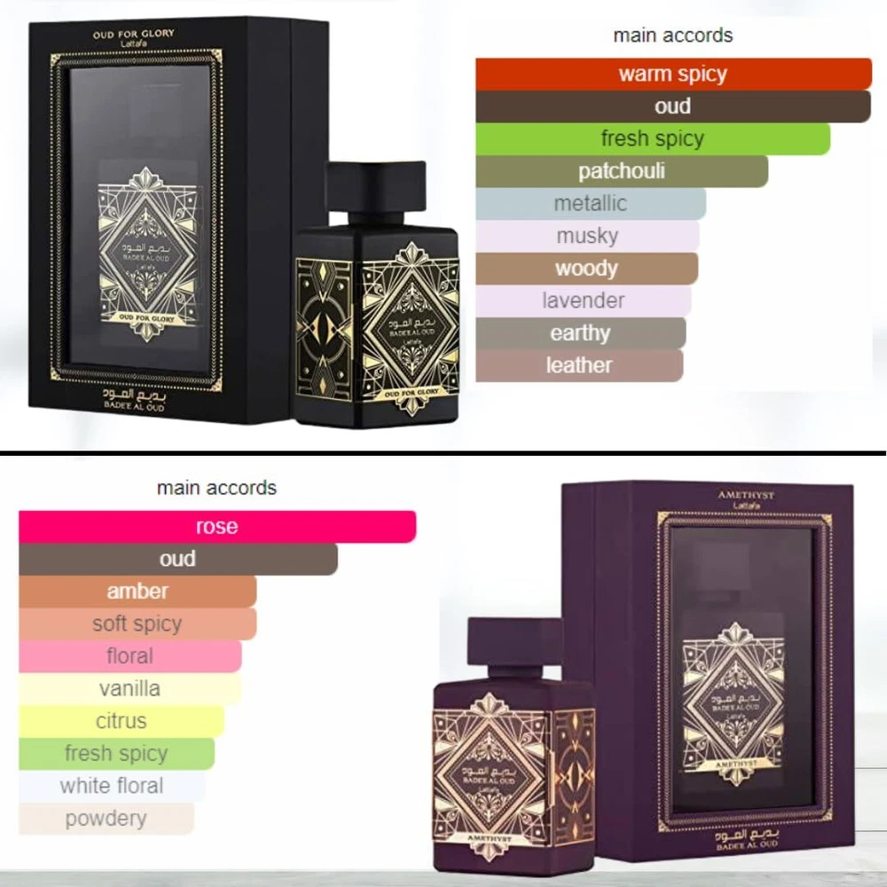 Bade'e Al Oud for Glory This perfume is a smoky, aromatic Oudh perfume for women and men. A trio of lavender, saffron and nutmeg open the perfume in the top note. Woody and earthy warm the heart notes with Oudh and patchouli. A dry, smoky base of Oudh, patchouli and musk forms the perfect finish. If you want a fragrance that makes you feel like a million dollars this is it right here! Top Notes: Saffron, Lavender, & Nutmeg Middle Notes: Agarwood & Patchouli Base Notes: Agarwood, Patchouli, & Musk ABOUT BADE'E AL OUD AMETHYST: Amethyst by is of the best unisex fragrances on the market, it’s luxurious and rich in aroma. The projection of this scent is absolutely outstanding. It’s simple yet elegant. This perfume presents a unique blend of classic spices and florals overlaid the prominent base of sweet vanilla and oud while also offering you the classic notes of rose, jasmine, and bergamot. If you want a fragrance that makes you feel like a million dollars this is it right here! Top Notes: Bergamot & Pink Pepper Heart Note: Turkish Rose, Bulgarian Rose, & Jasmine Base Notes: Vanilla, Amber, & Oud. ABOUT BADE'E AL OUD SUBLIME: Bade'e Al oud Sublime By perfumes is a asmoky, Aromatic Oudh perfume For women and men. A trio of lavender,saffron and nutmeg open the perfume in the top note. Woody and earthy warm the heart notes with oudh. "Bade’e Al Oud Honor & Glory" is an opulent and prestigious fragrance by , known for its luxurious blend of oud and oriental accords. This scent is a tribute to timeless traditions and regal elegance,offering a harmonious interplay of rich oud, exotic spices,and precious woods. It exudes an air of honor and glory, evoking a sense of majesty and splendor with every enchanting note.Top Notes: Pineapple Brulee. Heart Notes: Turmeric, Cinnamon, Black Pepper, Benzoin. Base Notes: Vanilla, Cashmeran, Sandalwood, Moss. This set contains a 3.4 Ounce Oud for Glory Eau de Parfum Spray & a 3.4 Ounce Amethyst Eau de Parfum Spray Fragrances that makes you feel like a million dollars Bade'e Al Oud for Glory This perfume is a smoky, aromatic Oudh perfume for women and men Amethyst by is of the best unisex fragrances on the market Perfect for all occasions