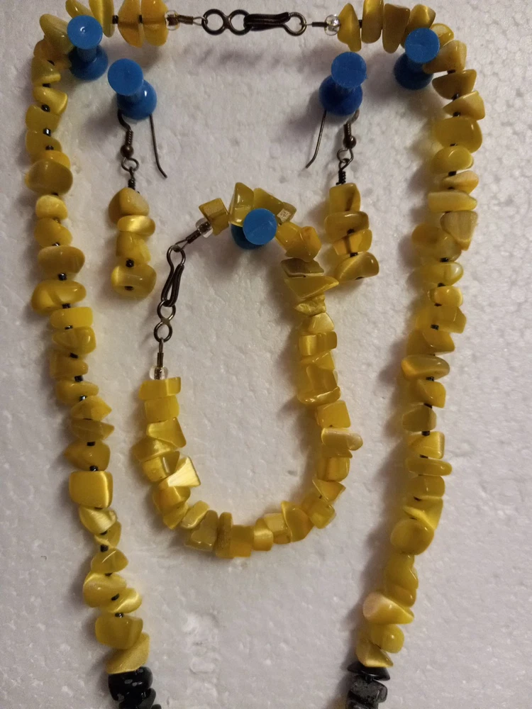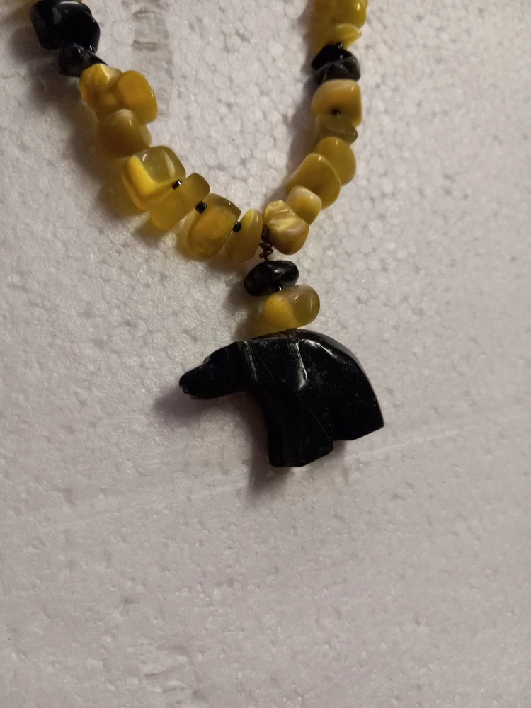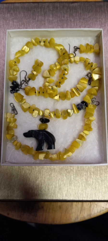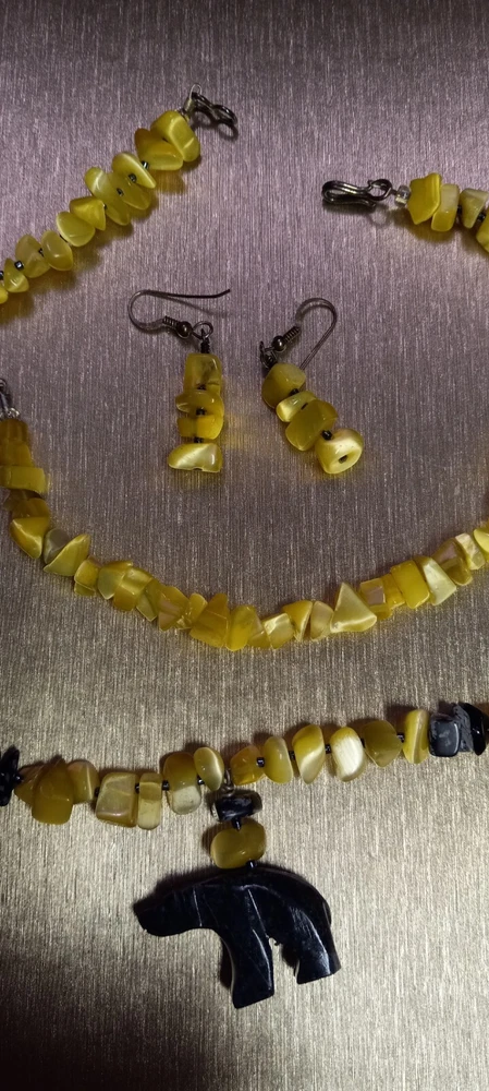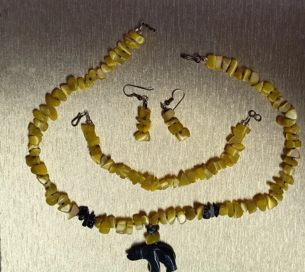 This Peridot Gemstone Bear Necklace Set features a charming design with polar bear-shaped main stones in a vibrant yellow color. The set includes earrings, a necklace, and a bracelet, all adorned with peridot gemstones. The main stone color and shape, as well as the overall theme of the set, create a unique and eye-catching jewelry ensemble perfect for adding a touch of whimsy to any outfit. Neaklace 17 inches Bracelet 6 inches Earrings 1.5 inches