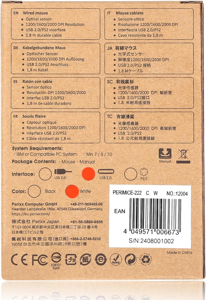 Perixx PERIMICE-222CW USB Type C Wired Optical Mouse, 1200/1600/2000 DPI, Long 5.9 Ft Cable, Compatible with Tablets, Laptops, and PCs, White Product Details Product Dimensions: 4.45 x 2.48 x 0.04 inches Item Weight: 2.89 ounces Item model number: 11941 Manufacturer: Perixx Country of Origin: China Brand: Perixx Connectivity Technology: USB Special Feature: Portable, Lightweight, Soundless Movement Detection Technology: Optical Number of Buttons: 4 MODERN CONNECTIVITY FOR ALL DEVICES: Easily connect to the latest tablets, laptops, and PCs with [USB Type-C] for seamless integration and reliable performance across all your devices. HASSLE-FREE SETUP AND EXTENDED REACH: Enjoy a simple plug-and-play experience with a [5.9 Ft long cord] that provides flexibility and freedom of movement, compatible with Windows 7/8/10/11 systems. WORK QUIETLY ANYWHERE: Experience distraction-free productivity with [Silent Click] technology, ideal for shared spaces or travel. Perfect for maintaining focus in any environment. ERGONOMIC DESIGN FOR ALL USERS: Designed for both right and left-handed users, this mouse offers [Neutral Design] for personalized comfort. Adjust the primary button settings for optimal workflow. ENHANCED PRECISION AND CONTROL: Achieve smooth tracking and pinpoint accuracy with adjustable [1200/1600/2000 DPI]. Features three responsive buttons and a compact size (113 x 63 x 37 mm) for effortless navigation.