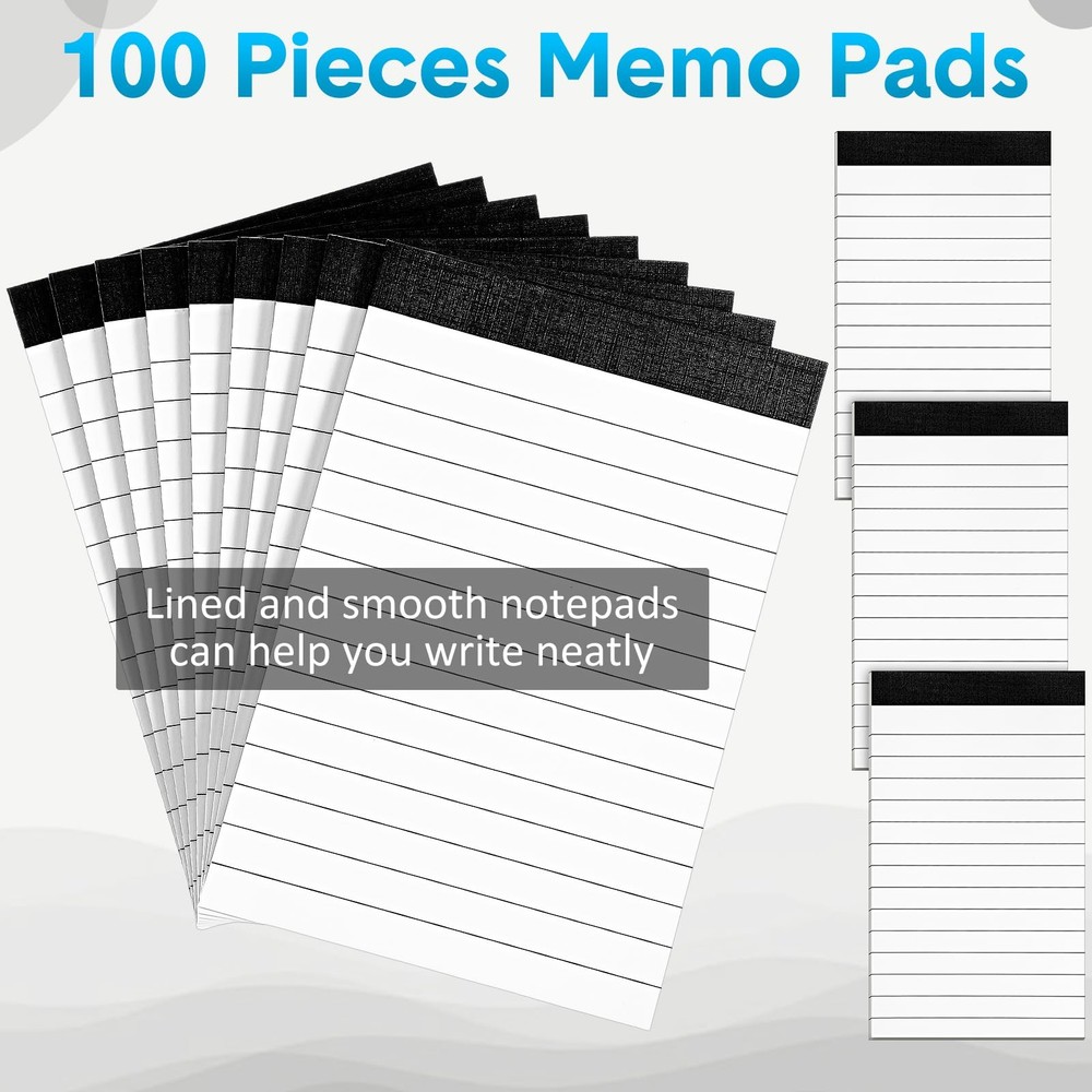 Features: Idea Gift: Give the gift of organization and inspiration with these small notepads. They're suitable for students, colleagues, or anyone who loves to stay organized and creative. Various Occasions: Whether for work, school, or personal use, these small legal pads are a versatile tool for anyone who needs to take notes or jot down ideas in meetings, lectures, brainstorming sessions, and more. Specifications: Material: paper, cardboard Color: black, white Size: 4 x 6 inches Package includes: 100 x Small Notepads Refills Warm notes: Please allow a little error on the size due to manual measurement. Valuable Package: you will receive 100 small notepads, so you get plenty of space to jot down your thoughts, to-do lists and reminders, enough for your daily writing and note taking needs Compact and Convenient: the 4 x 6 inches notepads bulk make them easy to carry around while still providing ample space for note taking, slip legal pads into your pocket, purse, or backpack and always have a place to write down your ideas Reliable Quality Paper: each small lined notepad features quality 80gsm paper that is thick enough to withstand heavy use, smooth on the surface, the single sided printed paper prevents ink from penetrating between pages, ensuring a clean and clear writing experience Easy to Tear: these memo pads are perforated for easy tearing individual sheets without leaving a messy edge, equipped with sturdy and thick cardboard pads, the note pads provides you with neat and orderly lines to keep your records organized and legible Versatile Use: whether you're at home, in offices, at school, or on the road, these small note pads 3x5 are suitable for keeping track of your daily tasks, brainstorming ideas, or even practicing your handwriting, these small writing pads are also the good helper for waiters and waitresses