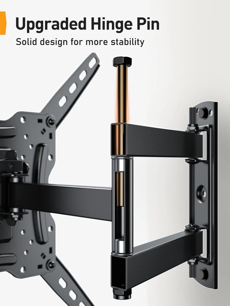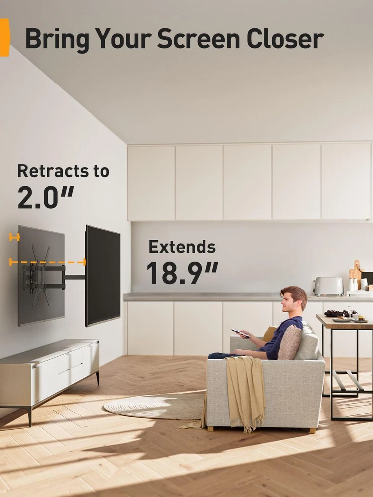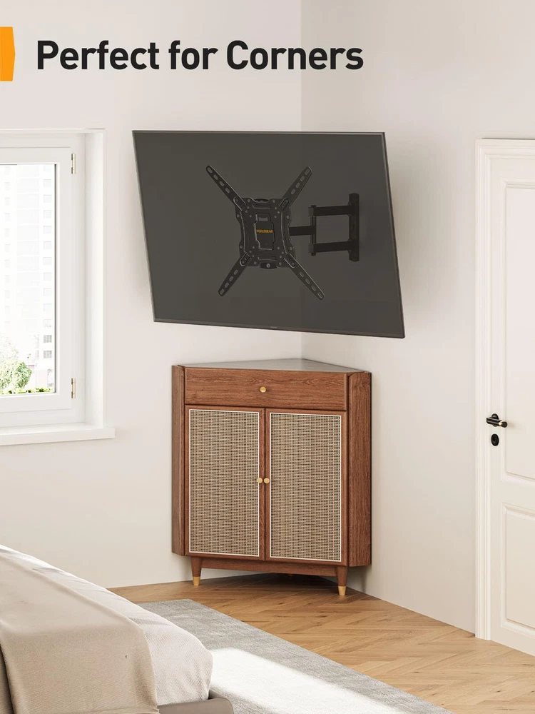 TV WAll Mount Compatibility: This tv mount fits most 26”-55” TVs with VESA patterns 75x75 to 400x400mm and weigh up to 60 lbs. Please verify the size, weight, and VESA mounting pattern of your TV before purchase wall mount tv brackets. Compatible with Samsung, Sony, Panasonic, Toshiba, Sharp, LG, Philips, JVC, and more other TV brands. Enjoy the Best View : The full motion tv mount features +90°/-90° swivel, +5°/-15° tilt, level the TV +/-3° after installation. Easily adjust the swivel tv wall mount to minimize screen glare for more comfort. Perfect for Corners & Space Saving: The single-stud design makes this tv mount the ideal solution for mounting your TV near a corner. The corner tv wall mount can extend out 18.9” from the wall and retract back to 2.0” for a low-profile look. It's perfect for smaller living rooms, kitchens, or rooms with non-standard wall stud spacing. Solid Steel Heavy Duty Construction: Crafted from sturdy cold-rolled steel, this tv mount 50 in has high standards. The 55 inch tv wall mount has stronger articulating arm and wider wall plate ensure that your TV will stay securely in place on the wall. Easy to Install: Mounting the mount for TV is as easy as 1-2-3. Step-by-step instructions and mounting hardware are included for hassle-free installation. Post-installation leveling allows you to fine-tune your TV’s position by +/-3° after mounting.