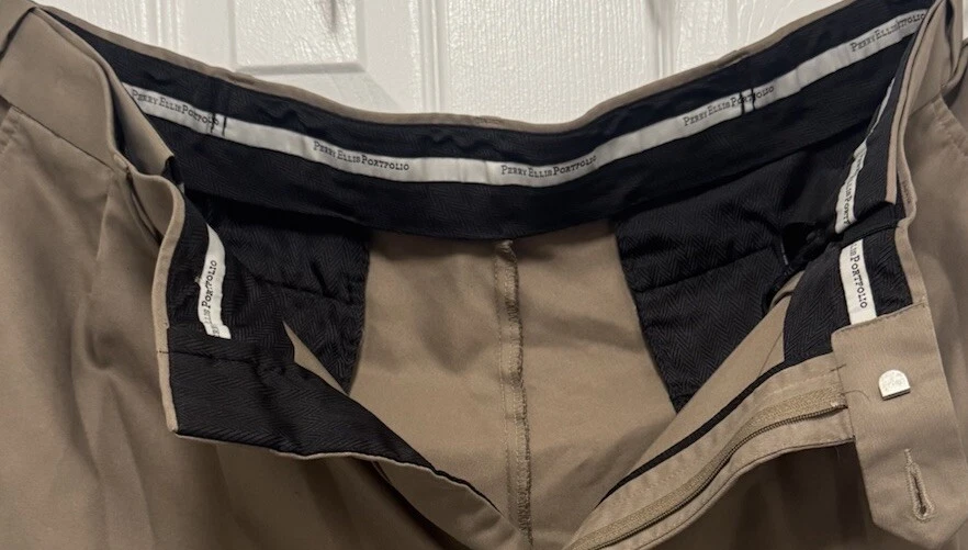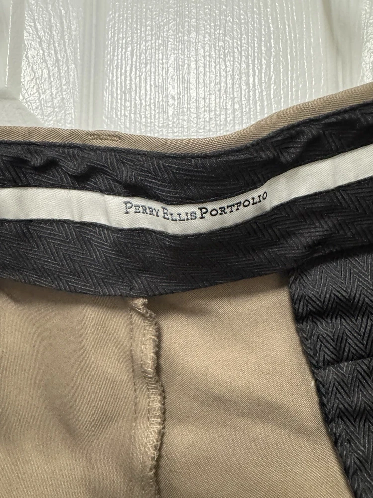 Perry Ellis Portfolio 100% Polyester Khakis 38x34 . Condition is Pre-owned. Shipped with USPS Ground Advantage.