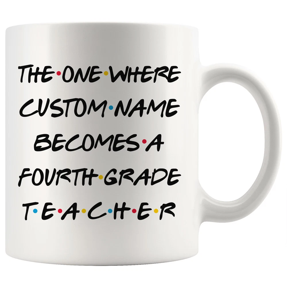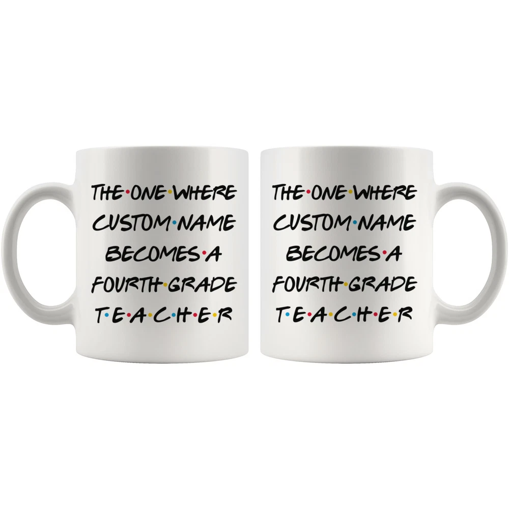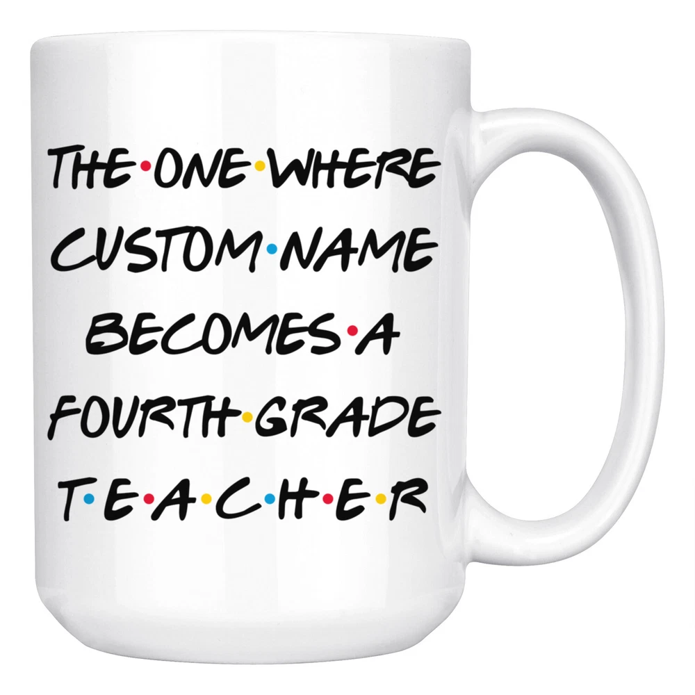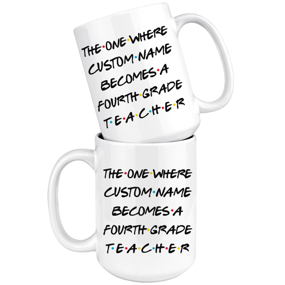 personalized 4th grade teacher coffee mug, gift for 4th grade teacher, fourth grade teacher graduation gift, 4th grade teacher coffee cup, gifts for men & women, mothers day gift, fathers day gift, career job appreciation gift, gifts for her, gifts for him This is the perfect coffee mug with content " THE ONE WHERE 'CUSTOM NAME' BECOMES A FOURTH GRADE TEACHER ". CUSTOM NAME Please put the custom name in the notes at the checkout or send us a message. By not doing this, it will delay your order. Example: Custom name: Lynda. A PERFECT GIFT FOR A FOURTH GRADE TEACHER ! This special coffee cup can be a great gift for the best 4th Grade Teacher. Bring a smile to your family member or friend with unique gift. DISHWASHER AND MICROWAVE SAFE! This version of ceramic mug shows it's true colors with quality assurance to withstand heat in the microwave and put it in the dishwasher as many times as you like, the quality will not be Altered. THE MUG DESIGN IS PRINTED ON BOTH SIDES! No matter if you hold your teacup in your right or left hand, you and everyone else will be able to see this unique design. Looking at this cute coffee mug will put a smile on everyone's face! We want you to be 100% satisfied, so please let us know if there is anything wrong with your order so we can fix it right away.