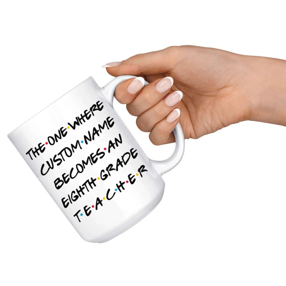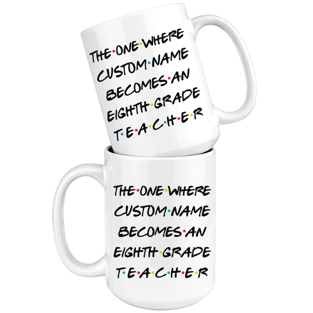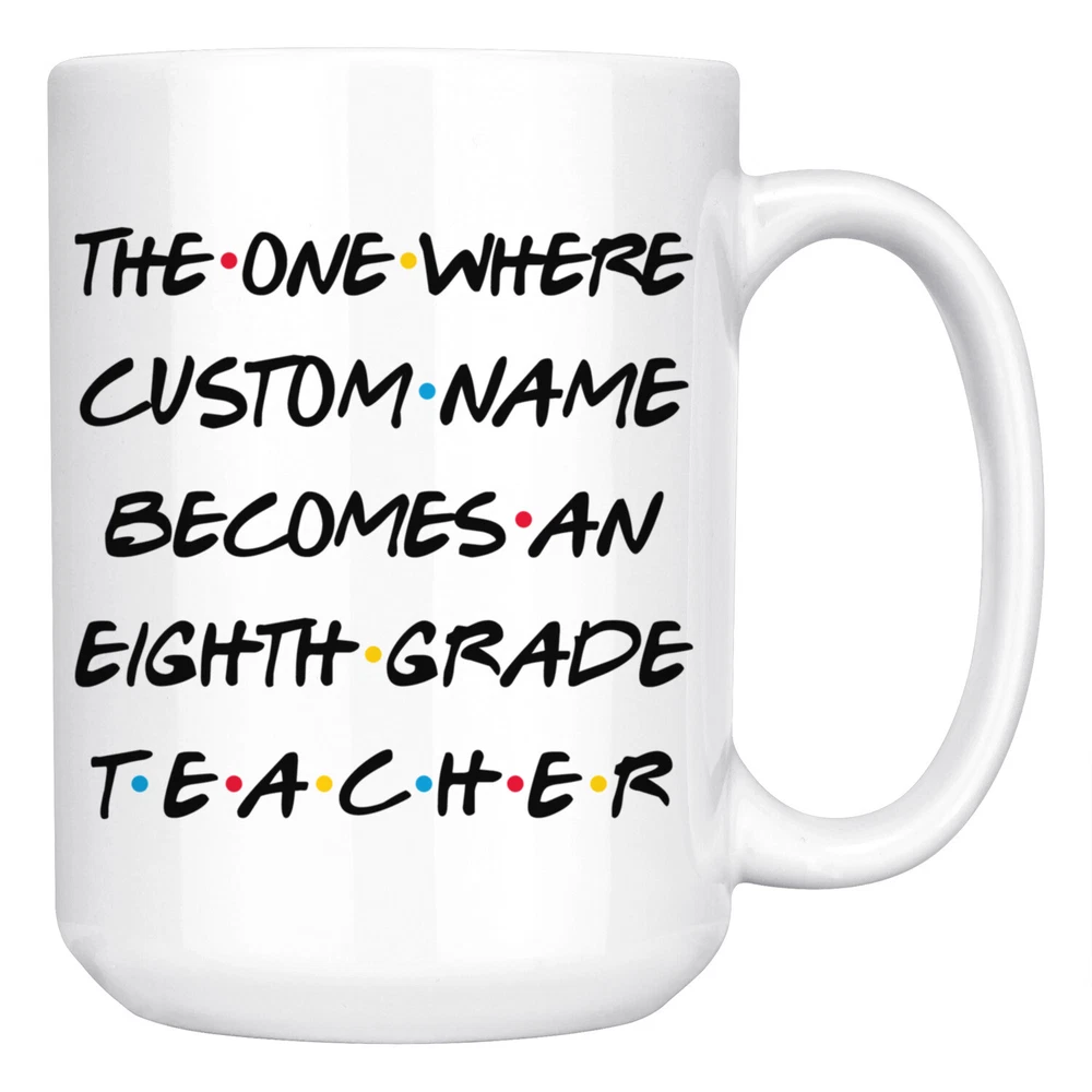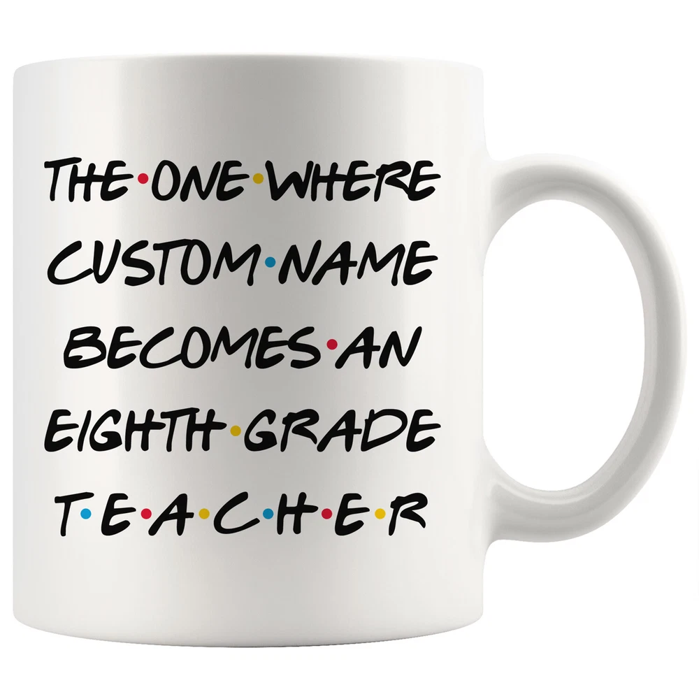personalized 8th grade teacher coffee mug, gift for 8th grade teacher, eighth grade teacher graduation gift, 8th grade teacher coffee cup, gifts for men & women, mothers day gift, fathers day gift, career job appreciation gift, gifts for her, gifts for him This is the perfect coffee mug with content " THE ONE WHERE 'CUSTOM NAME' BECOMES A EIGHTH GRADE TEACHER ". CUSTOM NAME Please put the custom name in the notes at the checkout or send us a message. By not doing this, it will delay your order. Example: Custom name: Lynda. A PERFECT GIFT FOR AN EIGHTH GRADE TEACHER ! can be a great gift for the best 8th Grade Teacher. Bring a smile to your family member or friend with unique gift. DISHWASHER AND MICROWAVE SAFE! This version of ceramic mug shows it's true colors with quality assurance to withstand heat in the microwave and put it in the dishwasher as many times as you like, the quality will not be Altered. THE MUG DESIGN IS PRINTED ON BOTH SIDES! No matter if you hold your teacup in your right or left hand, you and everyone else will be able to see this unique design. Looking at this cute coffee mug will put a smile on everyone's face! We want you to be 100% satisfied, so please let us know if there is anything wrong with your order so we can fix it right away.