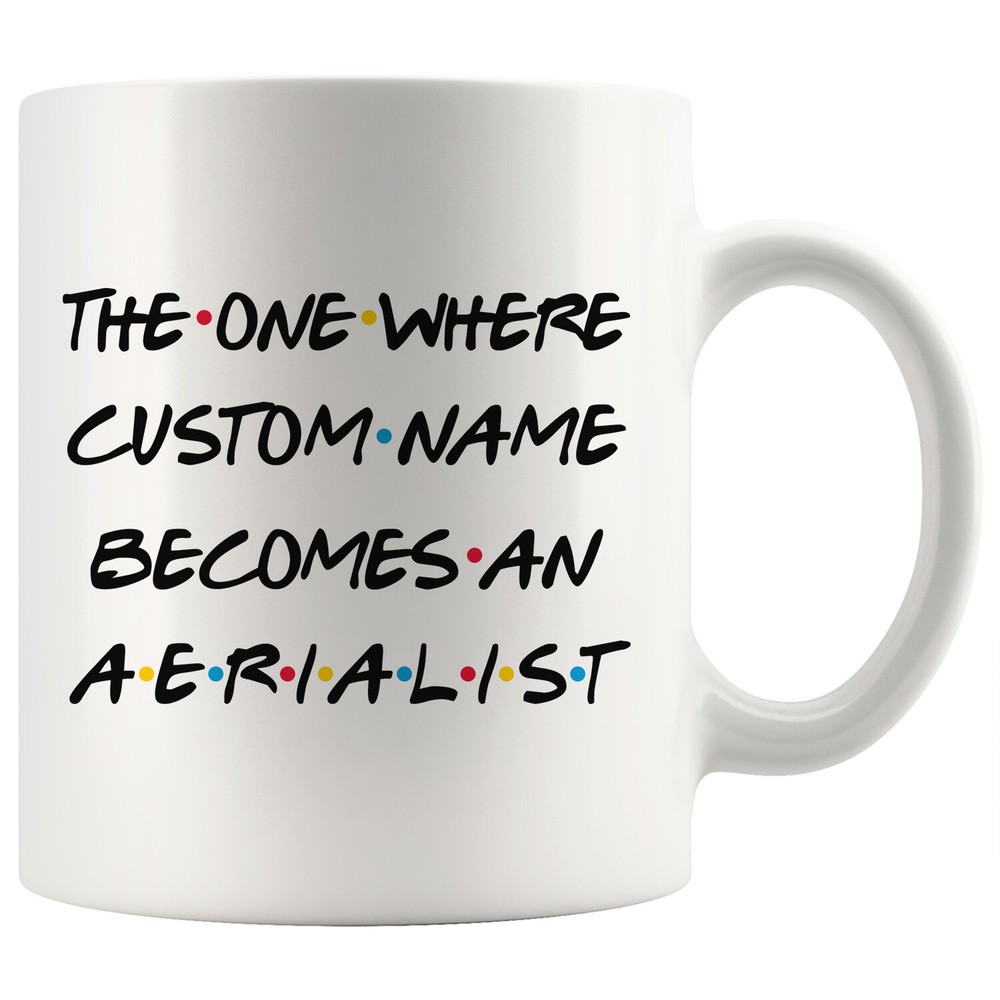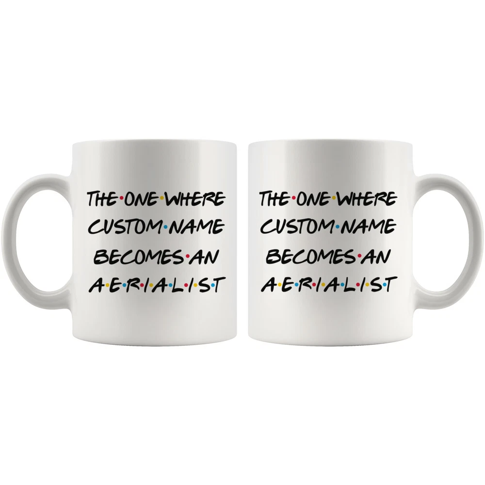 personalized aerialist coffee mug, aerialist graduation gift, aerialist job promotion coffee cup, gifts for men & women, mothers day gift, fathers day gift, aerialist career job appreciation gift, gifts for her, gifts for him This is the perfect coffee mug with content " THE ONE WHERE 'CUSTOM NAME' BECOMES AN AERIALIST ". CUSTOM NAME Please put the custom name in the notes at the checkout or send us a message. By not doing this, it will delay your order. Example: Custom name: Lynda. A PERFECT GIFT FOR AN AERIALIST ! This special coffee cup can be a great gift for the best Aerialist. Bring a smile to your family member or friend with unique gift. DISHWASHER AND MICROWAVE SAFE! This version of ceramic mug shows it's true colors with quality assurance to withstand heat in the microwave and put it in the dishwasher as many times as you like, the quality will not be Altered. THE MUG DESIGN IS PRINTED ON BOTH SIDES! No matter if you hold your teacup in your right or left hand, you and everyone else will be able to see this unique design. Looking at this cute coffee mug will put a smile on everyone's face! We want you to be 100% satisfied, so please let us know if there is anything wrong with your order so we can fix it right away.