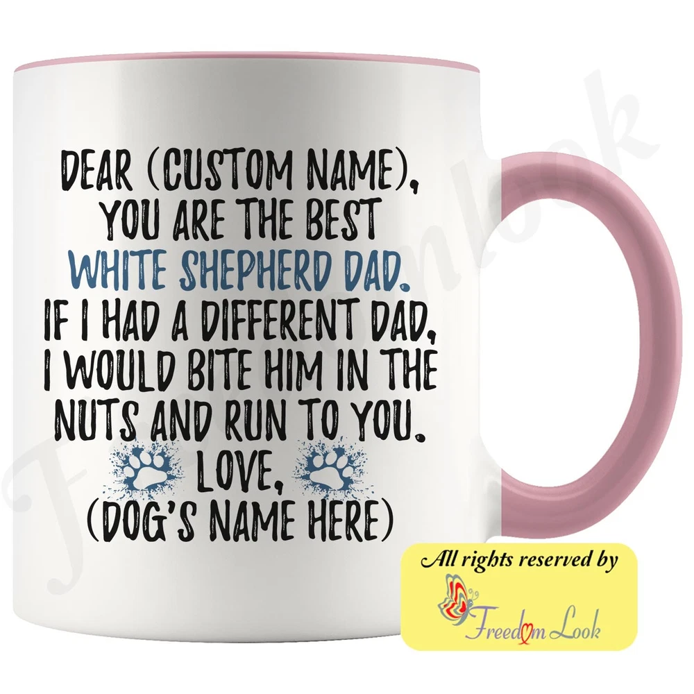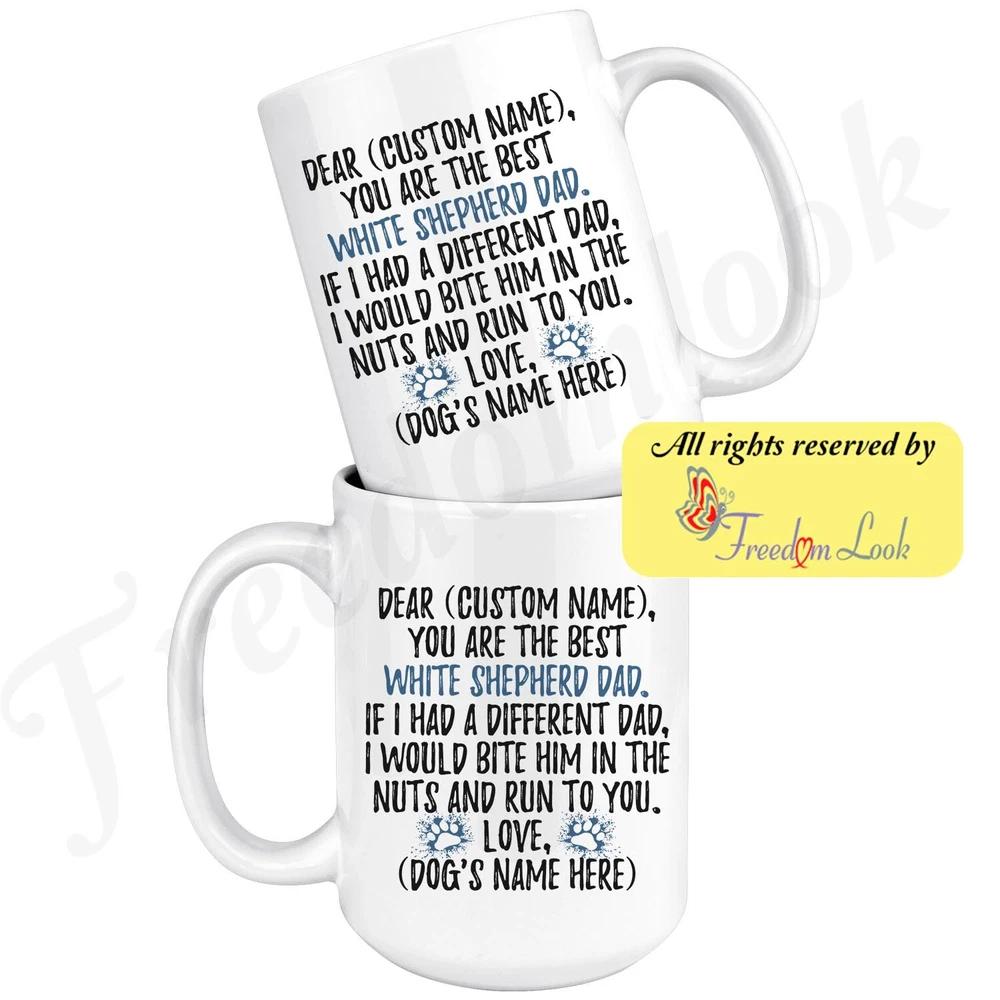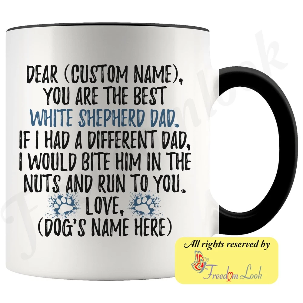 personalized american white shepherd dog mug, white canadian shepherd coffee mug, white german shepherd gifts, ws dad present gift, wgsd daddy mug, i love american white shepherd, custom american white shepherd gift, dog coffee cup, fathers day gift Are you looking for a great, unique and personalized gift for a dog owner? Search no more and get this mug TODAY. They will be thankful forever. Don't miss it because you'll regret it later by not getting it. This is the perfect coffee mug with content "DEAR 'CUSTOM NAME', YOU ARE THE BEST WHITE SHEPHERD DAD. IF I HAD A DIFFERENT DAD, I WOULD BITE HIM IN THE NUTS AND RUN TO YOU. LOVE, 'DOG'S NAME HERE' ". CUSTOM DAD'S NAME AND DOG'S NAME Please put the dad's and dog's name in the notes at the checkout or just send us a message. By not doing this, it will delay your order. Example: Dad's name: Bill; Dog's name: Charlie A PERFECT FUNNY GIFT FOR A WHITE SHEPHERD DOG DAD! This special coffee cup can be a great gift for every White Shepherd dad. Sizes: Colored coffee mug size: 11 oz White coffee mug size: 11 oz or 15 oz DISHWASHER AND MICROWAVE SAFE! This version of ceramic mug shows it's true colors with quality assurance to withstand heat in the microwave and put it in the dishwasher as many times as you like, the quality will not be Altered. THE MUG DESIGN IS PRINTED ON BOTH SIDES! No matter if you hold your teacup in your right or left hand, you and everyone else will be able to see this unique design. Looking at this cute coffee mug will put a smile on everyone's face! We want you to be 100% satisfied, so please let us know if there is anything wrong with your order so we can fix it right away. We truly offer the most stunning, unique and trendy highest-quality products in the world. All of our products are custom-made-to-order and handcrafted to the highest quality standards. We stand by our products the quality is outstanding rest assured. Triple check your address , we copy addresses exactly as written, any undeliverable orders due to customer error are not our responsibility. Mug for every day. Christmas birthday brother sister mom mother father dad aunt grandma grandpa girlfriend gift