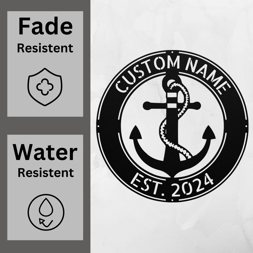 Product Description Personalized Anchor Metal Sign Custom Nautical Decor Gift for Home and Office Enhance your space with the Personalized Anchor Metal Sign ! Perfect for nautical enthusiasts, this sign adds a touch of charm to any home, office, or beach house. Crafted from 16 gauge high-quality metal , this sign is built to last. The powder coating ensures it is dust, weather, and water-resistant, making it suitable for both indoor and outdoor display. Key features include: Customizable Design: Personalize with names or messages to make it uniquely yours. Durable Construction: Made from sturdy metal for long-lasting enjoyment and style. Great Gift Idea: Perfect for Christmas, birthdays, or any special occasion for loved ones who appreciate the sea. Versatile Decor: Ideal for your living room, entryway, or office, bringing a nautical theme to your decor. The Personalized Anchor Metal Sign is more than just a decorative piece; it’s a way to express your love for the ocean and add a personal touch to your surroundings. Order yours today and make your space truly special! Service and Color Choice Our metal signs are designed to be personalized just for you, making them the perfect addition to any space! The default color for our signs is Black , but we also offer a variety of beautiful options including Copper, Gold, White, and Silver . After placing your order, simply contact us with your preferred color choice, and we'll ensure your sign is exactly how you envision it. Let’s create something special together!