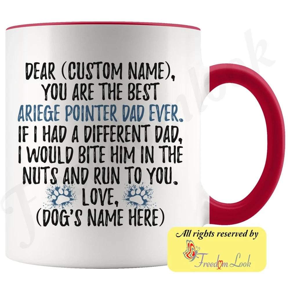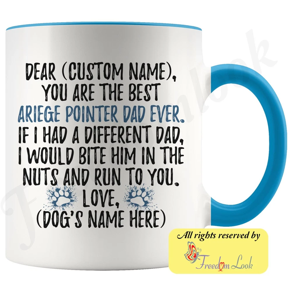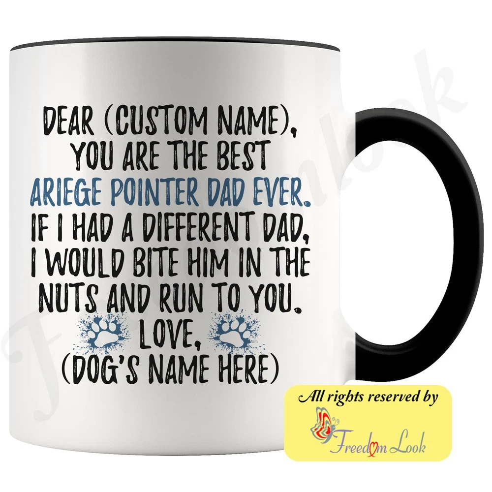 personalized ariege pointer dog mug, braque de l’ariège coffee mug, ariege pointing dog gifts, ariege pointer dad present gift, ariege pointer daddy mug, ariege pointer owner mug, i love ariege pointer, custom ariege pointer gift, dog coffee cup, fathers day gift Are you looking for a great, unique and personalized gift for a dog owner? Search no more and get this mug TODAY. They will be thankful forever. Don't miss it because you'll regret it later by not getting it. This is the perfect coffee mug with content "DEAR 'CUSTOM NAME', YOU ARE THE BEST ARIEGE POINTER DAD EVER. IF I HAD A DIFFERENT DAD, I WOULD BITE HIM IN THE NUTS AND RUN TO YOU. LOVE, 'DOG'S NAME HERE' ". CUSTOM DAD'S NAME AND DOG'S NAME Please put the dad's and dog's name in the notes at the checkout or just send us a message. By not doing this, it will delay your order. Example: Dad's name: Bill; Dog's name: Charlie A PERFECT FUNNY GIFT FOR AN ARIEGE POINTER DOG DAD! This special coffee cup can be a great gift for every Ariege Pointer dog dad. Sizes: Colored coffee mug size: 11 oz White coffee mug size: 11 oz or 15 oz DISHWASHER AND MICROWAVE SAFE! This version of ceramic mug shows it's true colors with quality assurance to withstand heat in the microwave and put it in the dishwasher as many times as you like, the quality will not be Altered. THE MUG DESIGN IS PRINTED ON BOTH SIDES! No matter if you hold your teacup in your right or left hand, you and everyone else will be able to see this unique design. Looking at this cute coffee mug will put a smile on everyone's face! We want you to be 100% satisfied, so please let us know if there is anything wrong with your order so we can fix it right away. We truly offer the most stunning, unique and trendy highest-quality products in the world. All of our products are custom-made-to-order and handcrafted to the highest quality standards. We stand by our products the quality is outstanding rest assured. Triple check your address , we copy addresses exactly as written, any undeliverable orders due to customer error are not our responsibility. Mug for every day. Christmas birthday brother sister mom mother father dad aunt grandma grandpa girlfriend gift