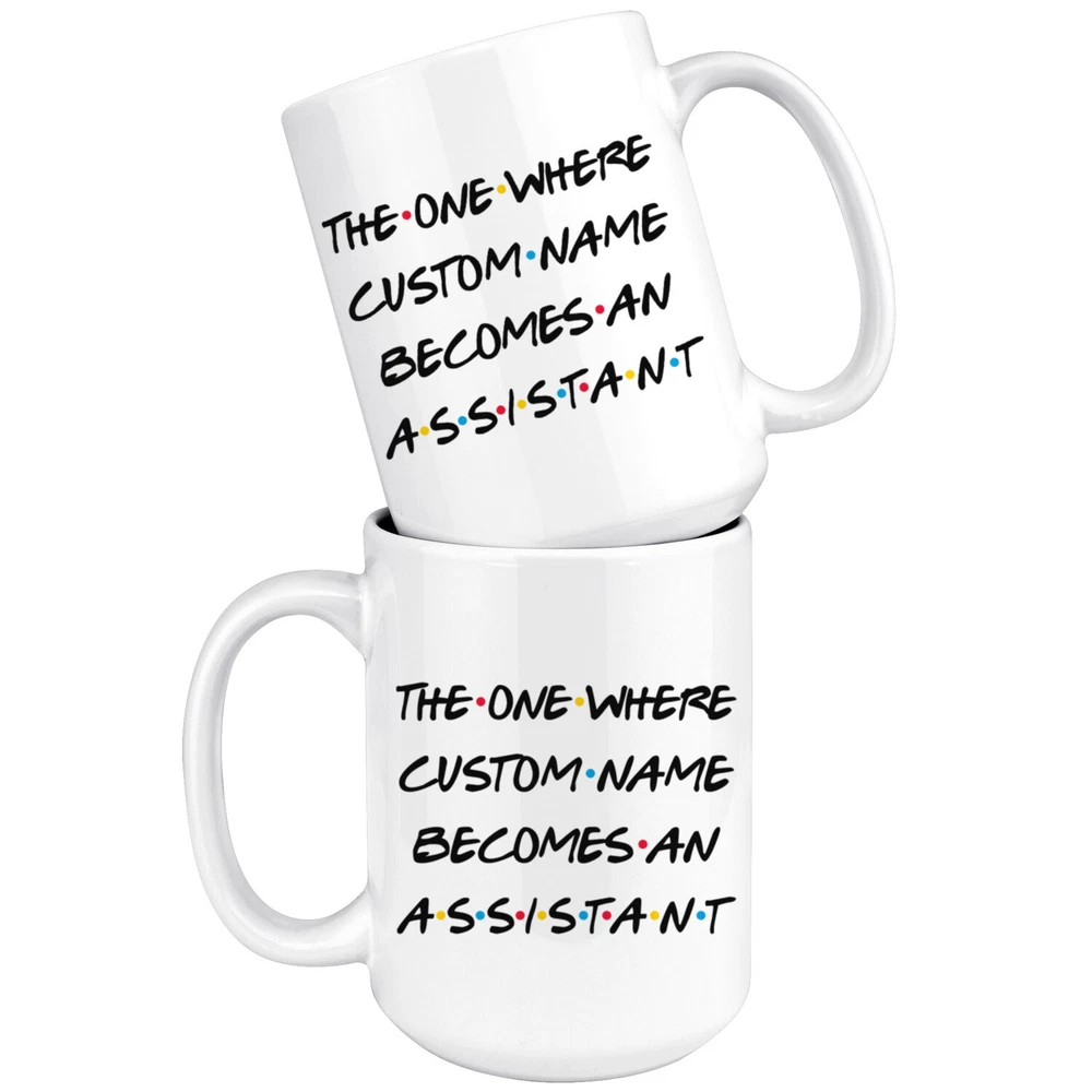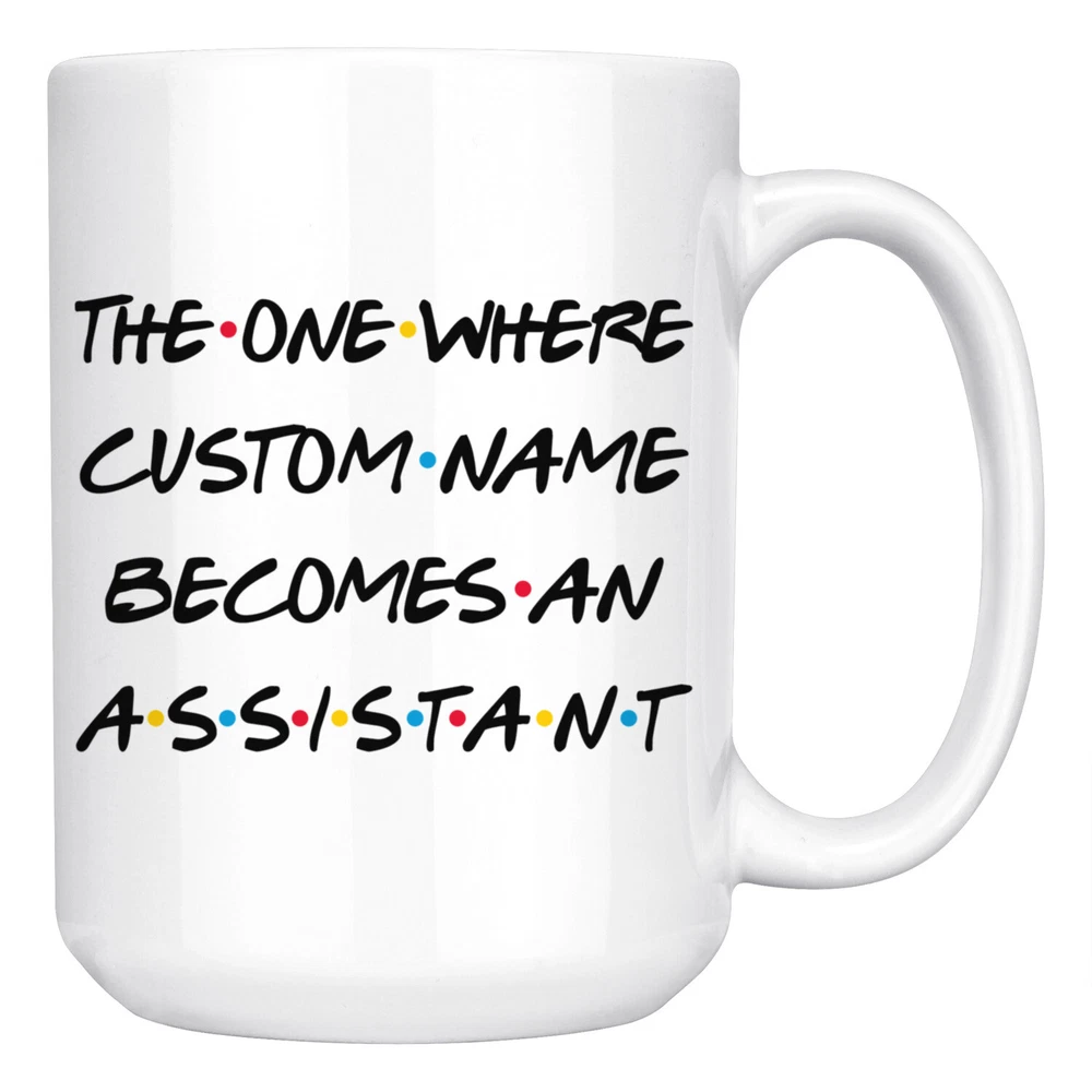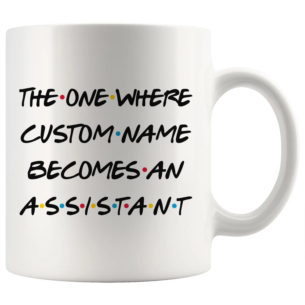 personalized assistant coffee mug, assistant graduation gift, assistant job promotion coffee cup, gifts for men & women, mothers day gift, fathers day gift, assistant career job appreciation gift, gifts for her, gifts for him This is the perfect coffee mug with content " THE ONE WHERE 'CUSTOM NAME' BECOMES AN ASSISTANT ". CUSTOM NAME Please put the custom name in the notes at the checkout or send us a message. By not doing this, it will delay your order. Example: Custom name: Lynda. A PERFECT GIFT FOR AN ASSISTANT ! This special coffee cup can be a great gift for the best Assistant. Bring a smile to your family member or friend with unique gift. DISHWASHER AND MICROWAVE SAFE! This version of ceramic mug shows it's true colors with quality assurance to withstand heat in the microwave and put it in the dishwasher as many times as you like, the quality will not be Altered. THE MUG DESIGN IS PRINTED ON BOTH SIDES! No matter if you hold your teacup in your right or left hand, you and everyone else will be able to see this unique design. Looking at this cute coffee mug will put a smile on everyone's face! We want you to be 100% satisfied, so please let us know if there is anything wrong with your order so we can fix it right away.