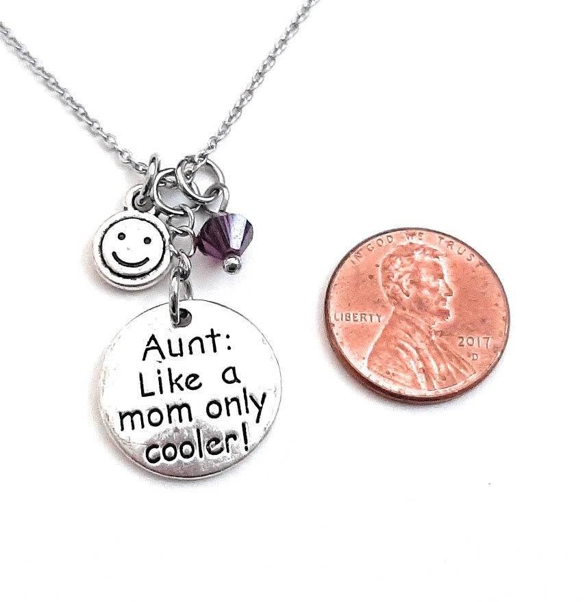 "Aunt: Like a mom only cooler" Customize your Necklace >>> CHOICE of CHARM & CRYSTAL, Choices are available in the 2nd and 3rd photos. In addition, the charm, pendant, and crystal can slide off the necklace, so that you can wear any combination of the 3. Wear the charm by itself, or the pendant and the crystal, or whatever combo you prefer. Use the side of the chain with the extender chain to slide the charms on and off. Makes a thoughtful & humorous gift to give to your favorite Aunt! Includes Stainless Steel 18 inch chain with attached 2 Inch Extender Chain. Let me know in a message if you would prefer 16 + 2 Inch extender. Circle Message Pendant measures about 3/4 inch across. The pendant is engraved on a round zinc alloy pendant. The charms are made of zinc alloy. They have an antique silver look and are tarnish resistant. Lead, Nickel and Cadmium free. Please visit our store for more great deals! We combine shipping for multiple items. If there are any excess shipping charges we will refund you after the shipment has been prepared. Shipping: We ship usually within 1 business day, sometimes same day. Orders 1 lb and under can be shipped USPS First Class Mail and over 1 lb are shipped Priority Mail. If you have an item that is lighter weight and can ship first class, you can upgrade to priority mail for an additional cost. Priority is recommended for all purchases since in most cases you will receive the item within 2-3 days after shipment and it is covered by insurance in the case that the package is damaged or lost. Feedback: We want your POSITIVE feedback! If you have any issues with your order, please message us first before leaving neutral or negative feedback and give us a chance to fix the problem. Payment: Please read the description carefully before purchasing, especially on items that size is important. Please contact us if you have a question about a listing. We require immediate payment and accept Paypal (credit/debit cards can also be used through Paypal) for all listings. Returns: If you wish to return an item, please contact us through the Ebay Return Request form. You must submit your request for return within 14 DAYS after receiving your item. You must also ship off your item within 5 DAYS after you submit your request. The item must be in original condition including tags still attached, box, hanger, etc. Tracking and Insurance are recommended. Your refund will be issued after your item has been received and approved.