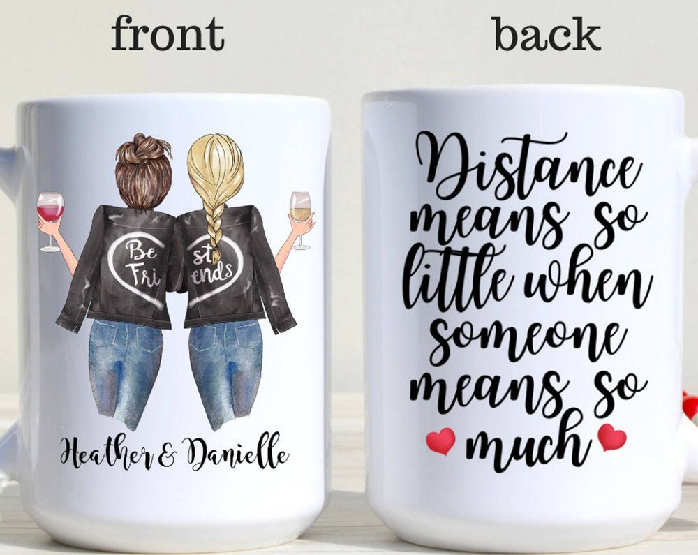 Best Friend Gift Long Distance Friendship Mug Personalized Best Friends Mug Product Details.. This high quality 11oz. ceramic white mug has a premium hard coat that provides crisp and vibrant color reproduction sure to last for years. Perfect for all hot & cold beverages. The highest quality printing possible is used. It will never fade no matter how many times you wash it. Material: 100% Ceramic. Print both sides. Dishwasher and Microwave Safe. High Gloss + Premium White Finish. Printed in the U.S.A. Personalized & Custom. We support personalized and custom mug to add custom, when placing an order, you can add notes to the "order note" in shipping address section. Also you can contact us directly via message. Shipping Info. Ready to ship in 1 to 2 business days, All products are made-to-order and proudly printed in the United States. Shipped by USPS and DHL, You will receive your order in 5-7 days. Replace & Refund. All products are defective during shipping broken, chipped will be replaced free of charge. You are not satisfied with the product, we will refund 100% money to you. If any other issues arise, please do not hesitate to message, we would be more than happy to assist you.