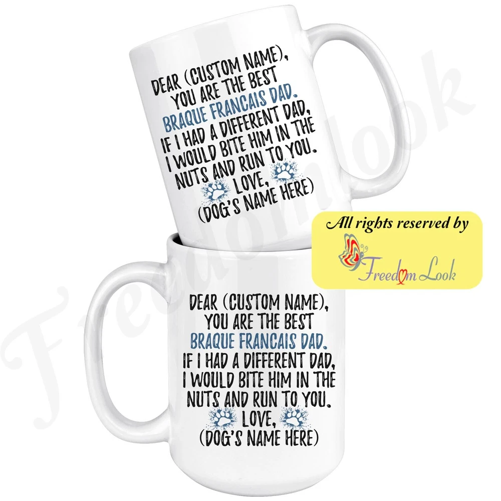 personalized braque francais dog mug, braque francais pyrenean coffee mug, french pointing dog gifts, braque francais dad present gift, braque francais dog daddy, braque francais dog owner, i love braque francais, custom braque francais dog gift, dog coffee cup, fathers day gift Are you looking for a great, unique and personalized gift for a dog owner? Search no more and get this mug TODAY. They will be thankful forever. Don't miss it because you'll regret it later by not getting it. This is the perfect coffee mug with content "DEAR 'CUSTOM NAME', YOU ARE THE BEST BRAQUE FRANCAIS DAD. IF I HAD A DIFFERENT DAD, I WOULD BITE HIM IN THE NUTS AND RUN TO YOU. LOVE, 'DOG'S NAME HERE' ". CUSTOM DAD'S NAME AND DOG'S NAME Please put the dad's and dog's name in the notes at the checkout or just send us a message. By not doing this, it will delay your order. Example: Dad's name: Bill; Dog's name: Charlie A PERFECT FUNNY GIFT FOR AN BRAQUE FRANCAIS DOG DAD! This special coffee cup can be a great gift for every French Pointing dog dad. Sizes: Colored coffee mug size: 11 oz White coffee mug size: 11 oz or 15 oz DISHWASHER AND MICROWAVE SAFE! This version of ceramic mug shows it's true colors with quality assurance to withstand heat in the microwave and put it in the dishwasher as many times as you like, the quality will not be Altered. THE MUG DESIGN IS PRINTED ON BOTH SIDES! No matter if you hold your teacup in your right or left hand, you and everyone else will be able to see this unique design. Looking at this cute coffee mug will put a smile on everyone's face! We want you to be 100% satisfied, so please let us know if there is anything wrong with your order so we can fix it right away. We truly offer the most stunning, unique and trendy highest-quality products in the world. All of our products are custom-made-to-order and handcrafted to the highest quality standards. We stand by our products the quality is outstanding rest assured. Triple check your address , we copy addresses exactly as written, any undeliverable orders due to customer error are not our responsibility. Mug for every day. Christmas birthday brother sister mom mother father dad aunt grandma grandpa girlfriend gift