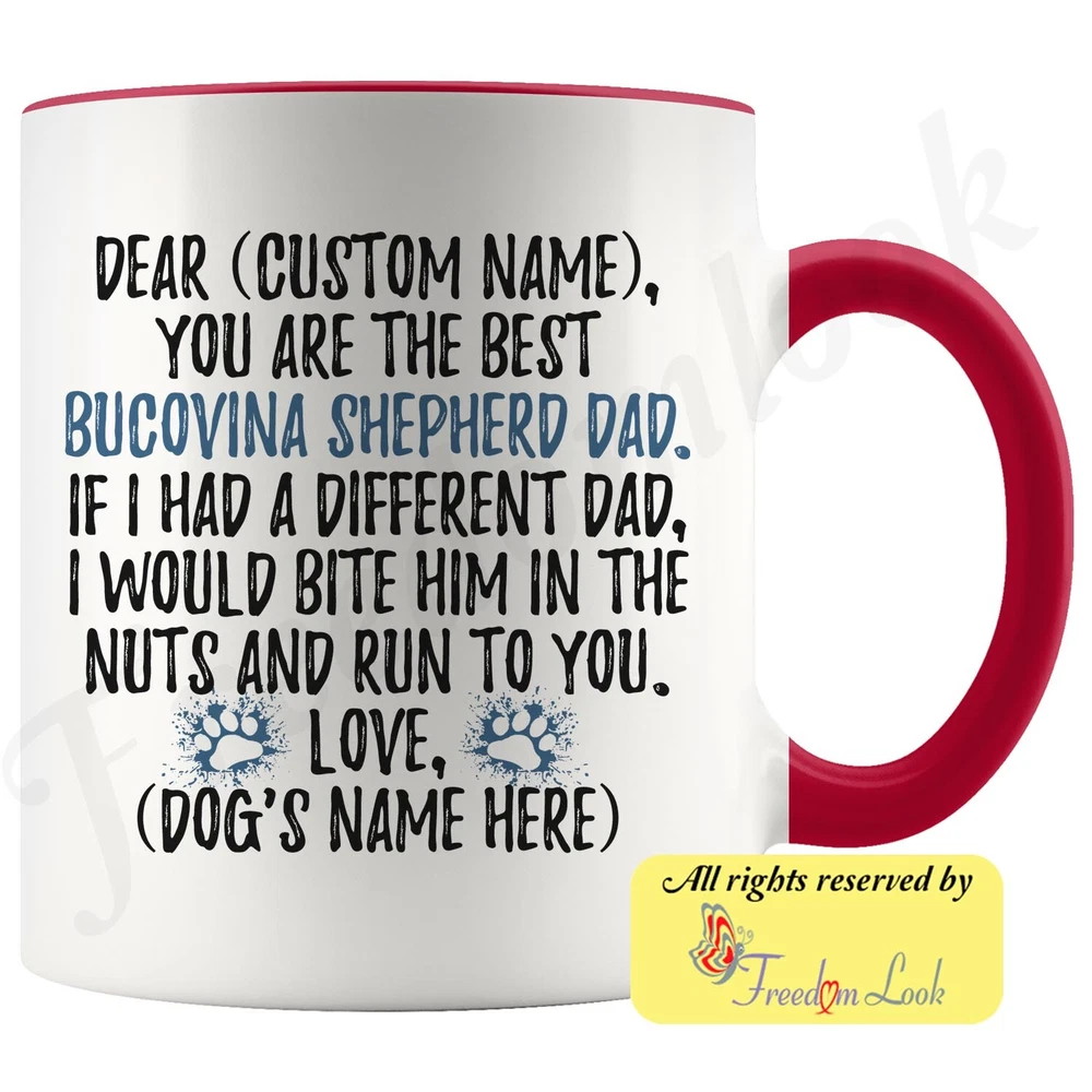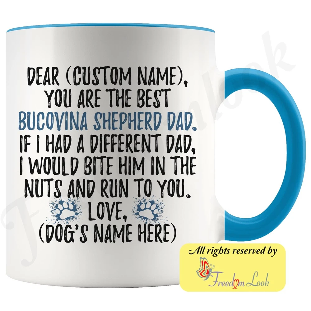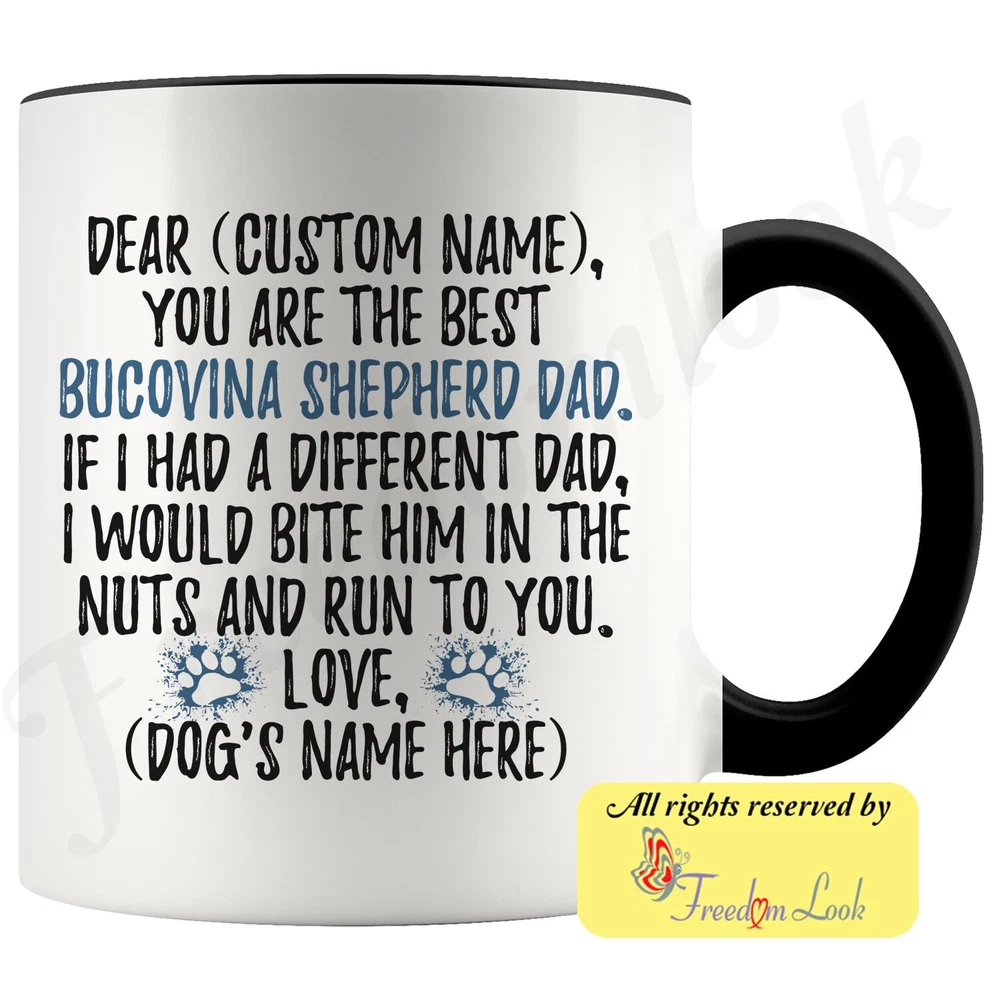 personalized bucovina shepherd dog mug, bucovina sheepdog coffee mug, romanian bukovina sheepdog gifts, bucovina shepherd dad present gift, bucovina shepherd dog daddy mug, bucovina shepherd owner, i love bucovina dog, custom dog gifts, dog coffee cup, fathers day gift Are you looking for a great, unique and personalized gift for a dog owner? Search no more and get this mug TODAY. They will be thankful forever. Don't miss it because you'll regret it later by not getting it. This is the perfect coffee mug with content "DEAR 'CUSTOM NAME', YOU ARE THE BEST BUCOVINA SHEPHERD DAD. IF I HAD A DIFFERENT DAD, I WOULD BITE HIM IN THE NUTS AND RUN TO YOU. LOVE, 'DOG'S NAME HERE' ". CUSTOM DAD'S NAME AND DOG'S NAME Please put the dad's and dog's name in the notes at the checkout or just send us a message. By not doing this, it will delay your order. Example: Dad's name: Bill; Dog's name: Charlie A PERFECT FUNNY GIFT FOR A BUCOVINA SHEPHERD DOG DAD! This special coffee cup can be a great gift for every Bucovina dog dad. Sizes: Colored coffee mug size: 11 oz White coffee mug size: 11 oz or 15 oz DISHWASHER AND MICROWAVE SAFE! This version of ceramic mug shows it's true colors with quality assurance to withstand heat in the microwave and put it in the dishwasher as many times as you like, the quality will not be Altered. THE MUG DESIGN IS PRINTED ON BOTH SIDES! No matter if you hold your teacup in your right or left hand, you and everyone else will be able to see this unique design. Looking at this cute coffee mug will put a smile on everyone's face! We want you to be 100% satisfied, so please let us know if there is anything wrong with your order so we can fix it right away. We truly offer the most stunning, unique and trendy highest-quality products in the world. All of our products are custom-made-to-order and handcrafted to the highest quality standards. We stand by our products the quality is outstanding rest assured. Triple check your address , we copy addresses exactly as written, any undeliverable orders due to customer error are not our responsibility. Mug for every day. Christmas birthday brother sister mom mother father dad aunt grandma grandpa girlfriend gift