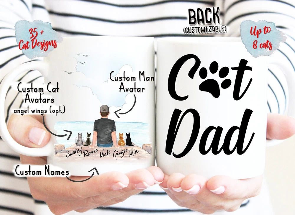 Personalized Cat Mug Cat Dad Mug Cat Daddy Coffee Mug Cat Lover Mug Pet Mug Cat Dad Gift Cat Coffee Cup Cat Gifts Custom Cat Mug Product Details.. This high quality 11oz. ceramic white mug has a premium hard coat that provides crisp and vibrant color reproduction sure to last for years. Perfect for all hot & cold beverages. The highest quality printing possible is used. It will never fade no matter how many times you wash it. Material: 100% Ceramic. Print both sides. Dishwasher and Microwave Safe. High Gloss + Premium White Finish. Printed in the U.S.A. Personalized & Custom. We support personalized and custom mug to add custom, when placing an order, you can add notes to the "order note" in shipping address section. Also you can contact us directly via message. Shipping Info. Ready to ship in 1 to 2 business days, All products are made-to-order and proudly printed in the United States. Shipped by USPS and DHL, You will receive your order in 5-7 days. Replace & Refund. All products are defective during shipping broken, chipped will be replaced free of charge. You are not satisfied with the product, we will refund 100% money to you. If any other issues arise, please do not hesitate to message, we would be more than happy to assist you.