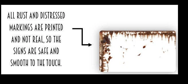 All metal signs ship via USPS - please make sure your address is correct :-) NOTE: All rustic add-ons including any rust, distressed marks, etc. are printed on and not real, so the signs are smooth to the touch. • We have multiple sizes available. To see our current sizes available, click the drop down menu for each style. • We highly recommend taking tape and measuring the spot you plan on placing the sign at to ensure you order the right size for your perfect spot! All signs are made to order custom just for you! • Background Color Options: White With Faux Rust (main text is black), White With Distressed Black Edge (main text is black and edge is distressed black), Distressed Black With Faux Rust (main text is white) and Distressed Black With NO Rust (main text is white). ***METAL SIGN FEATURES*** • Aluminum Metal Sign With Rounded Corners • Indoor or Outdoor Use • Two Hanging Options: 1. Ready To Hang – Two Pre-Drilled Holes Centered On The Shortest Sides Of The Sign As Shown In The Photo Slide Above (No Hardware Is Included). These holes can NOT be moved to a different location. Screws are NOT included due to the wide variety of material types the metal signs may be hung on. 2. No Holes – Command Strips Are Popular For Hanging Versus Nails • Thickness: 0.032 Inches - Perfect for thin light-weight art on the wall! There is a picture in the slide show that shows the thickness as well. • Gloss Print - Increased Vibrancy Of Artwork • All metal signs ship in 1 to 3 business days. • Colors can vary a bit on different monitors and screens. Any props included in photos are not included. Please be sure to double-check your address to make sure it is accurate for USPS delivery. If a package is returned to us due to an invalid address, the buyer is responsible for all additional shipping charges. We have chosen aluminum metal versus other types of metal due to it not rusting. As anything in sunlight, the signs can fade over time.