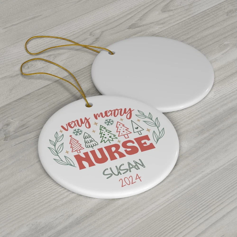 Personalized Ceramic Ornament Gift For A Nurse Holiday Tree Decoration Nurse Appreciation Christmas Gift Keepsake Ornament Custom Material: Ceramic Color: White Shapes: Circle, star, heart and oval Can be printed on both sides Imprint full-color artwork, photos, or logos Hole for hanging string and hanging string included Printed in the USA