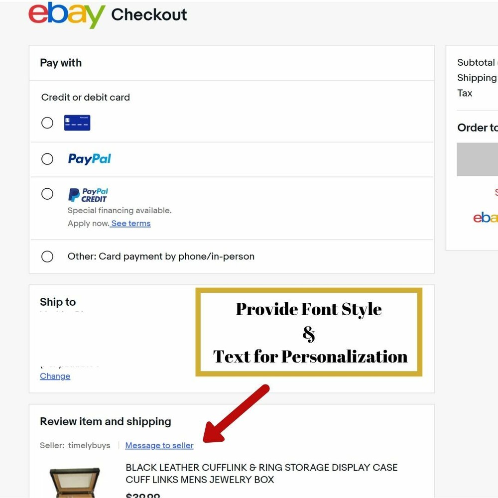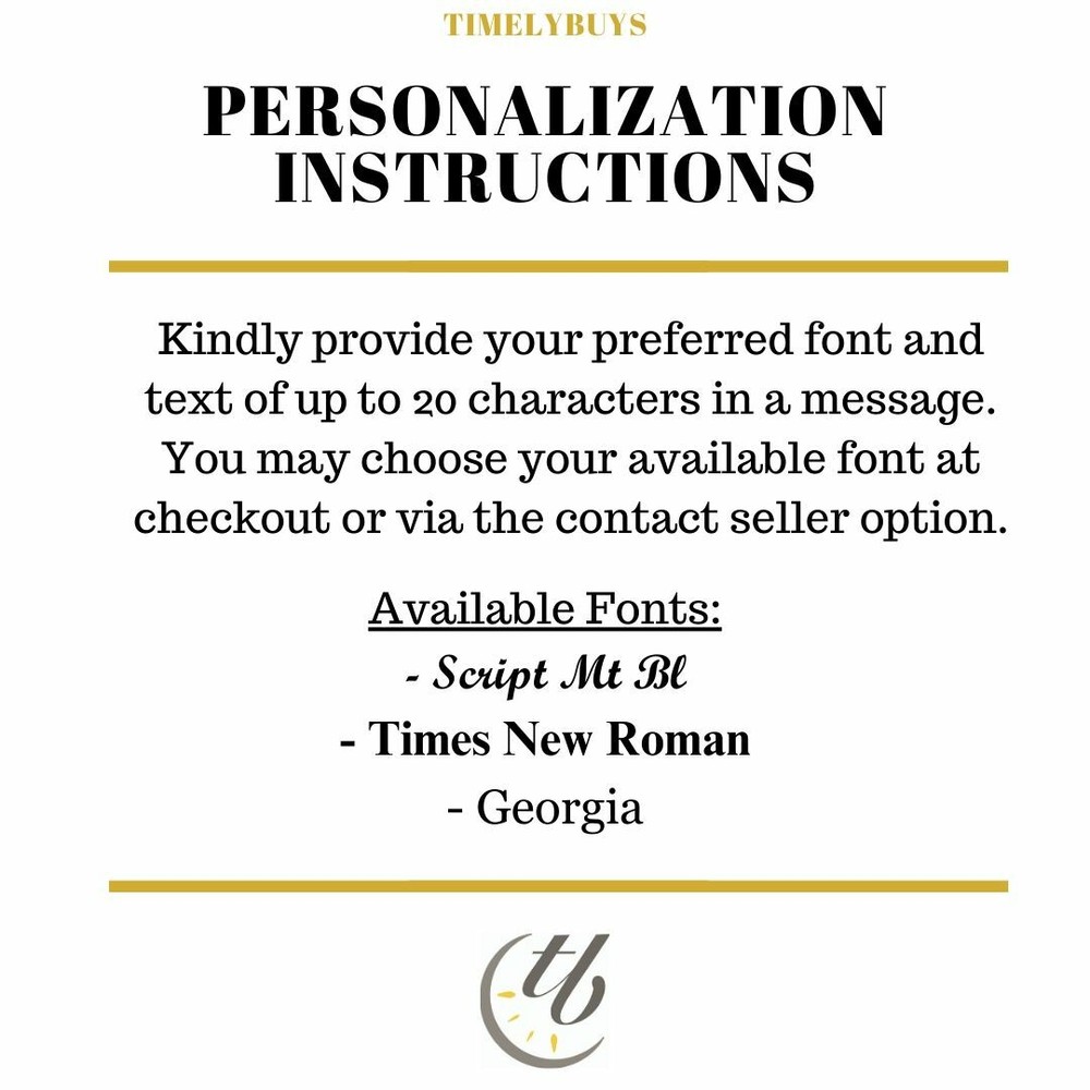 Powered by Frooition Watch Display Cases Eyeglass Display Cases Tie and Belt Display Cases Pen Display Cases Coins, Cufflinks & More Travel and Tech Phone Cases Calendars and Paper Hair Accessories Faith & Inspirational Gifts Drinkware Holiday and Special Occasions Gifts for Her Watch Winders Fashionable Car Accessories Gifts for Him Designer Shower Curtains Holiday Gifts Embroidered Towel Sets JEWELRY Baby For Your Feet Beach Bags & Totes All Items See our eBay store for more great items >> Shop Categories Watch Display Cases 30 Piece Watch Boxes 18-24 Piece Watch Boxes 6-12 Piece Watch Boxes Oversized Watch Boxes Travel Storage Watch Boxes Watch Pillows Watch and Sunglass Boxes Eyeglass Display Cases For 12-24 Eyeglasses For 3-8 Eyeglasses For Travel For Eyeglasses and Watches Tie and Belt Display Cases Pen Display Cases Coins, Cufflinks & More Coin & Valet Trays Cufflink Cases Travel and Tech Phone Cases & Wristlets Pill Boxes TSA Bags, Luggage Tags ... Crossbody Bags iPad Accessories Cosmetic Cases Passport & Jewelry Cases Hair, Lingerie & Shoe Bags Personal Care Phone Cases Calendars and Paper Hair Accessories Faith & Inspirational Gifts Drinkware Holiday and Special Occasions Gifts for Her Watch Winders Fashionable Car Accessories Gifts for Him Designer Shower Curtains Holiday Gifts Embroidered Towel Sets JEWELRY Necklaces Handcuff Cuff Bracelets Earrings Edforce Greek Bangles Baby For Your Feet Beach Bags & Totes Helpful Links Add to Favorite Sellers Sign up to Newsletter View Feedback Contact Seller Visit seller's eBay Shop About Seller Page Personalized 12 Cherry Wood Watch Box Display Case Jewelry Organizer Item Description Personalization Instructions: Kindly provide your preferred font and text of up to 20 characters in a message. You may choose your available font at checkout or via the contact seller option. *See images for example* Product Features: TIMELYBUYS DISPLAY CASES: Versatile 12 WATCH CASE for men and women; Part of our new LUXURY collection with coordinating cases for watches, pens, and cufflinks; Engravable plate for customization; TimelyBuys display cases are known for their first-class workmanship, material, and design. FREE CUSTOMIZATION AND OFFER: Design and showcase your one of a kind watch collection or create a personalized message for your favorite gift recipient. Whether you personalize with your name, initials, or a loving message - customization up to 20 characters is FREE. Black Laser Engraving on Silver Flexo. All personalized cases include a TIMELYBUYS CLEANING CLOTH to keep your watch collection looking brand new. CONSTRUCTION: Stunning cherry wood finish with stainless accents, engravable plate, glass top, and upgraded velvet pillows and lining highlight the attractive modern design unique to this case. Tastefully protects, stores, and organizes up to 12 watches. Each watch compartment features removable deluxe 2" watch pillows which can hold a small or large watch up to 51 mm CASE DIMENSIONS: Case measures 8.25" Deep x 14.5" Wide x 3.38" High; Watch Compartments: 3.25" L x 2" W; Holds watches up to 51 mm; Pillows: 2.75" L x 2" W TIMELY SHIPPING & CUSTOM ORDER GUARANTEE: All custom orders ship within 2 to 4 business days. Customer satisfaction is our first priority. ENGRAVED & PERSONALIZED items are all made to order; accordingly, returns are only authorized in the event of damage or error in customization. Elegant gift for your husband, wife, mother, father, friend. This is a BRAND NEW addition to our large collection of watch cases and winders. This customizable watch display case can be personalized with your name, initials, or a unique message sure to make you smile. Store and display your favorite watches in one convenient and attractive place. This elegant piece offers great versatility and can be used in your home or office. Eliminate clutter and keep your watches safe and scratch-free. Provide the ultimate protection for your collection. Great gift idea! About Us About Us Payment Shipping Our Products Returns About Us TimelyBuys . . . Because timely shipping counts. TimelyBuys is a leading online provider of watch and eyeglass display cases, tie and belt cases, desk and valet trays, as well as premier gift items from designer brands. All products are brand new, with all original tags and packaging. Shop with confidence. We are committed to offering quality products at an affordable price. Customers rely on our prompt communication throughout their entire eBay experience, beginning with product inquiries and ending with our 100% Satisfaction Guarantee. Payment Payment Payment Information: All major credit cards accepted PayPal Payment required within 3-5 days Checkout via eBay's secure system using the Pay Now Button or email link provided If payment is not received within 7 days, we will file an Unpaid Item Dispute and relist the product. Shipping Shipping U.S. Shipping : Free shipping on all orders to the United States Shipping Time: We ship daily Monday-Friday and process all orders within 1 business day, once payment has cleared. Lightening Speed: See our customer feedback for details on our speed and delivery. Shipping Carriers: We ship via USPS, UPS, or FedEx based on weights and dimensions. If you have a specific request regarding one of these carriers, please notify us at the time of payment. Packaging: All items are inspected, verified, and securely packed prior to shipment. International Shipping: Fees calculated at checkout based on country Shipping Time: We ship daily Monday-Friday and process all orders within 1 business day, once payment has cleared. Shipping Carriers: We ship via USPS, UPS, or FedEx based on weights and dimensions. If you have a specific request regarding one of these carriers, please notify us at the time of payment. International Duties: The Buyer is responsible for any customs/duties imposed. These fees are not included in the item or shipping price, as they are collected by the carrier and determined by 