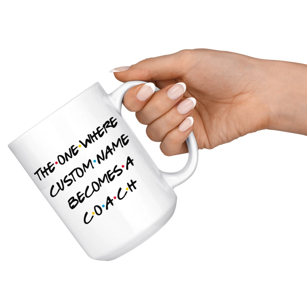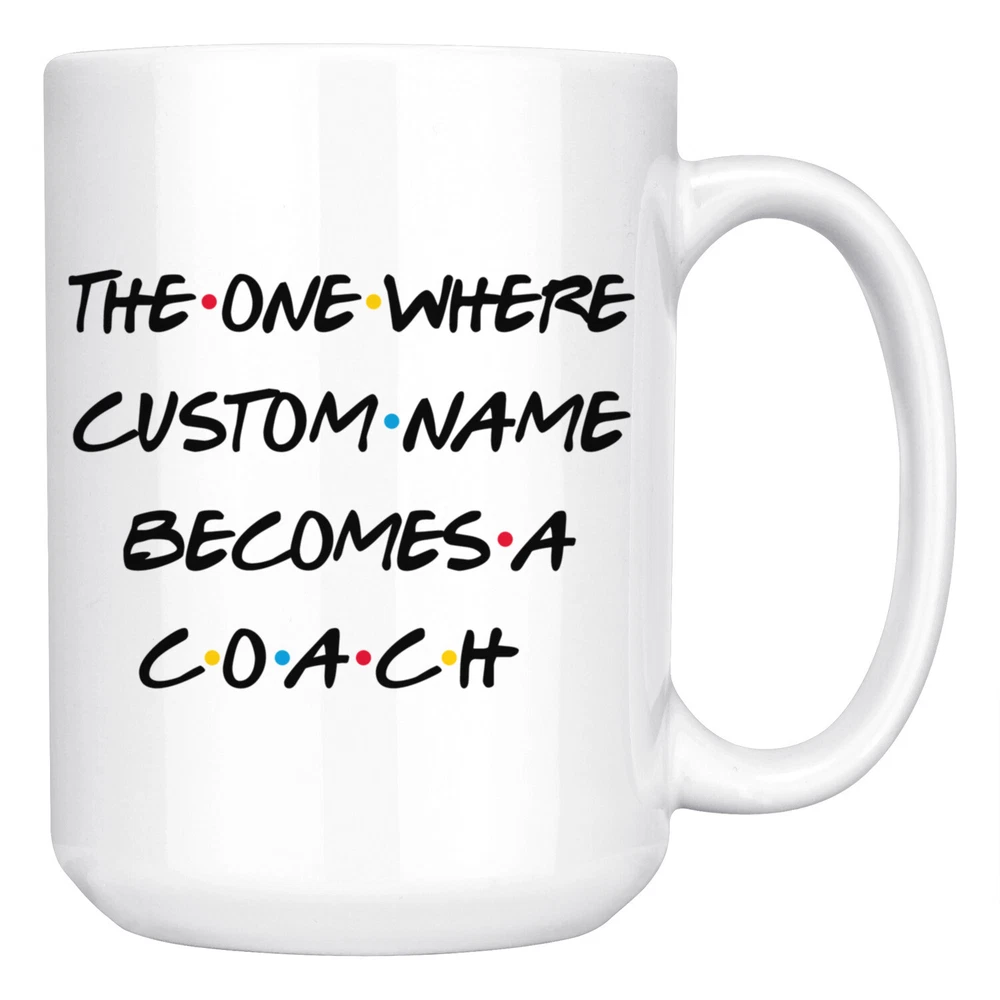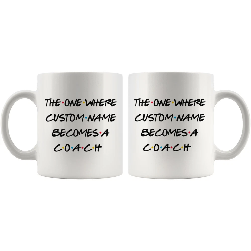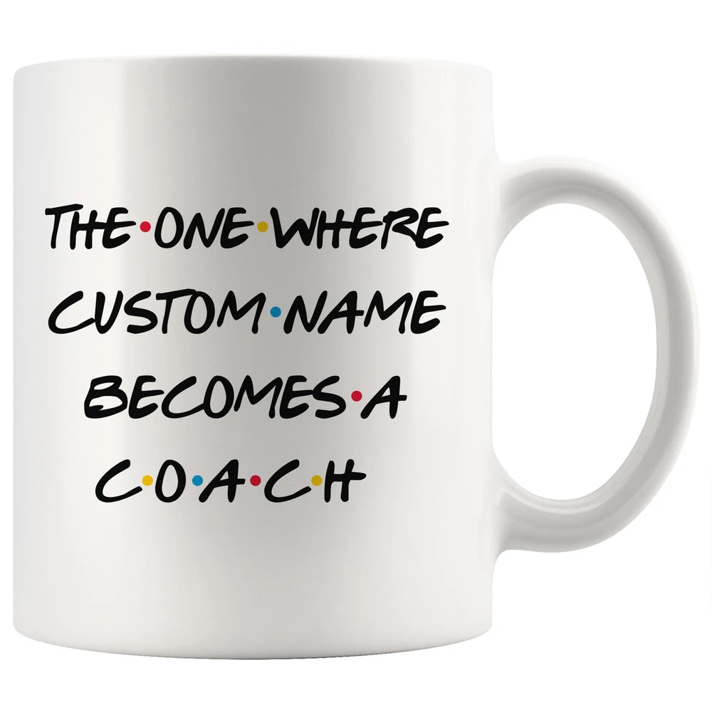personalized coach coffee mug, gift for a coach, coach present gift, coach job promotion, coach coffee cup, gifts for men & women, best coach coffee mug, mothers day gift, fathers day gift, coach career job appreciation gift, gifts for her, gifts for him This is the perfect coffee mug with content " THE ONE WHERE 'CUSTOM NAME' BECOMES A COACH ". CUSTOM NAME Please put the custom name in the notes at the checkout or send us a message. By not doing this, it will delay your order. Example: Custom name: Lynda. A PERFECT GIFT FOR A COACH ! This special coffee cup can be a great gift for the best Coach. Bring a smile to your family member or friend with this unique gift . DISHWASHER AND MICROWAVE SAFE! This version of ceramic mug shows it's true colors with quality assurance to withstand heat in the microwave and put it in the dishwasher as many times as you like, the quality will not be Altered. THE MUG DESIGN IS PRINTED ON BOTH SIDES! No matter if you hold your teacup in your right or left hand, you and everyone else will be able to see this unique design. Looking at this cute coffee mug will put a smile on everyone's face! We want you to be 100% satisfied, so please let us know if there is anything wrong with your order so we can fix it right away.