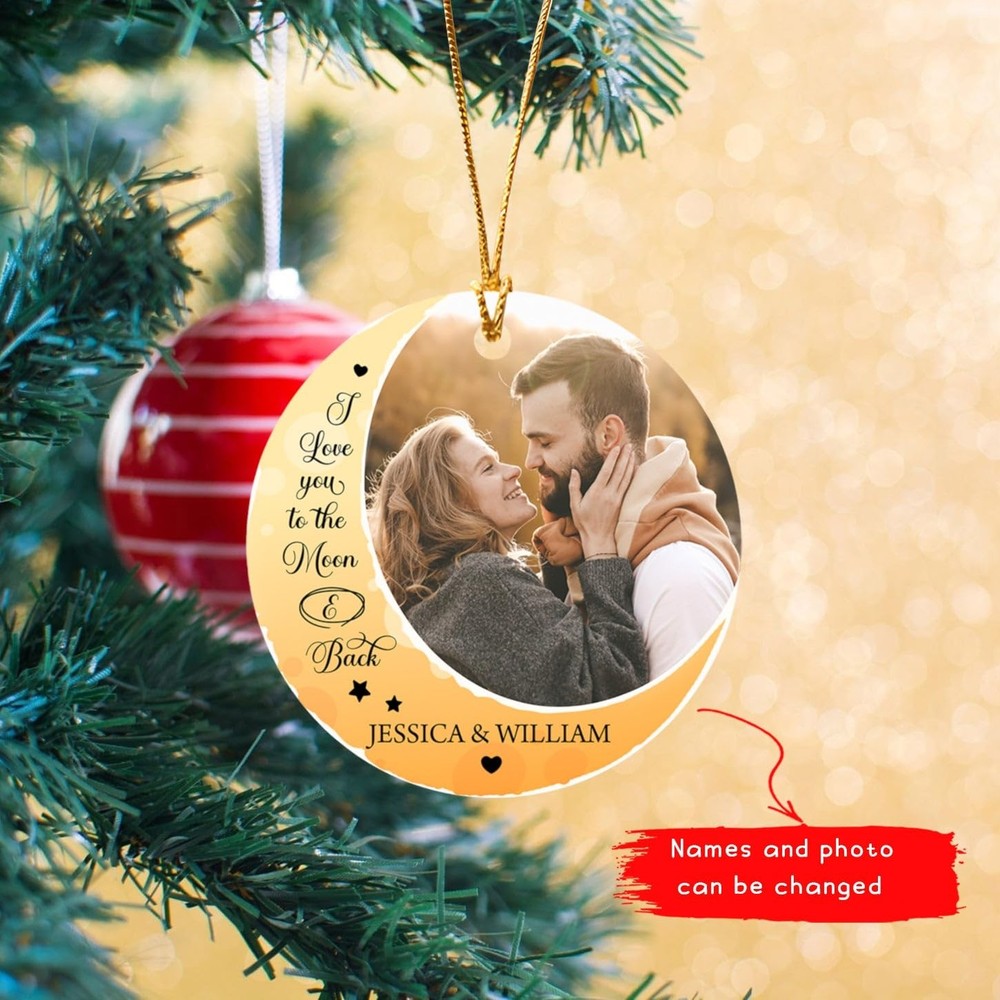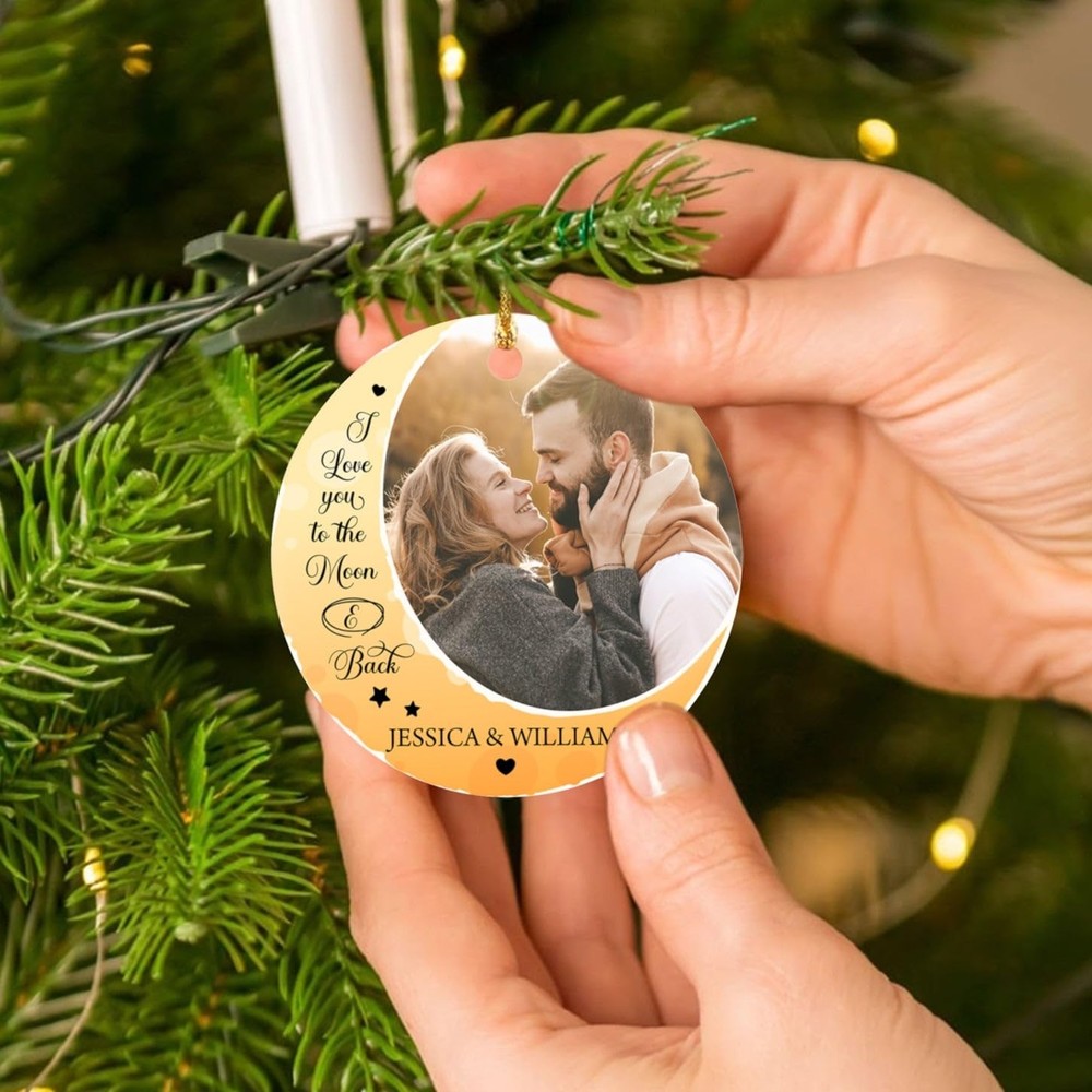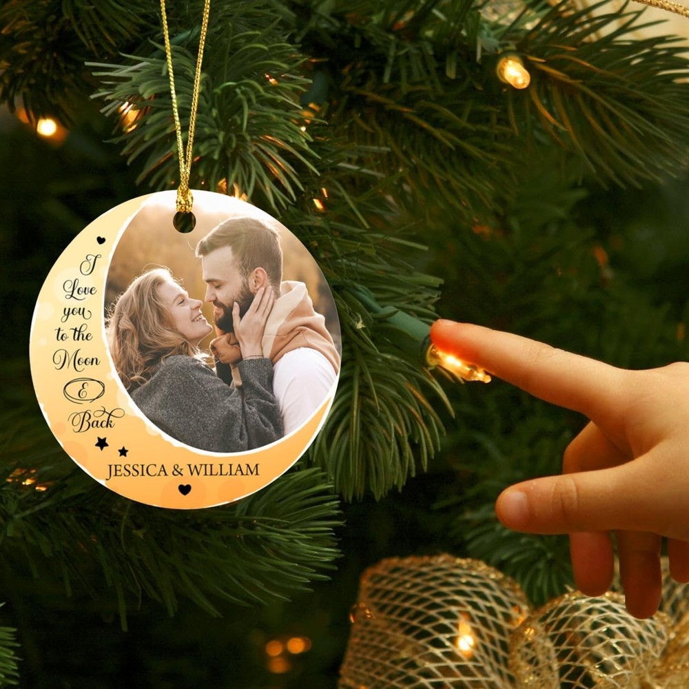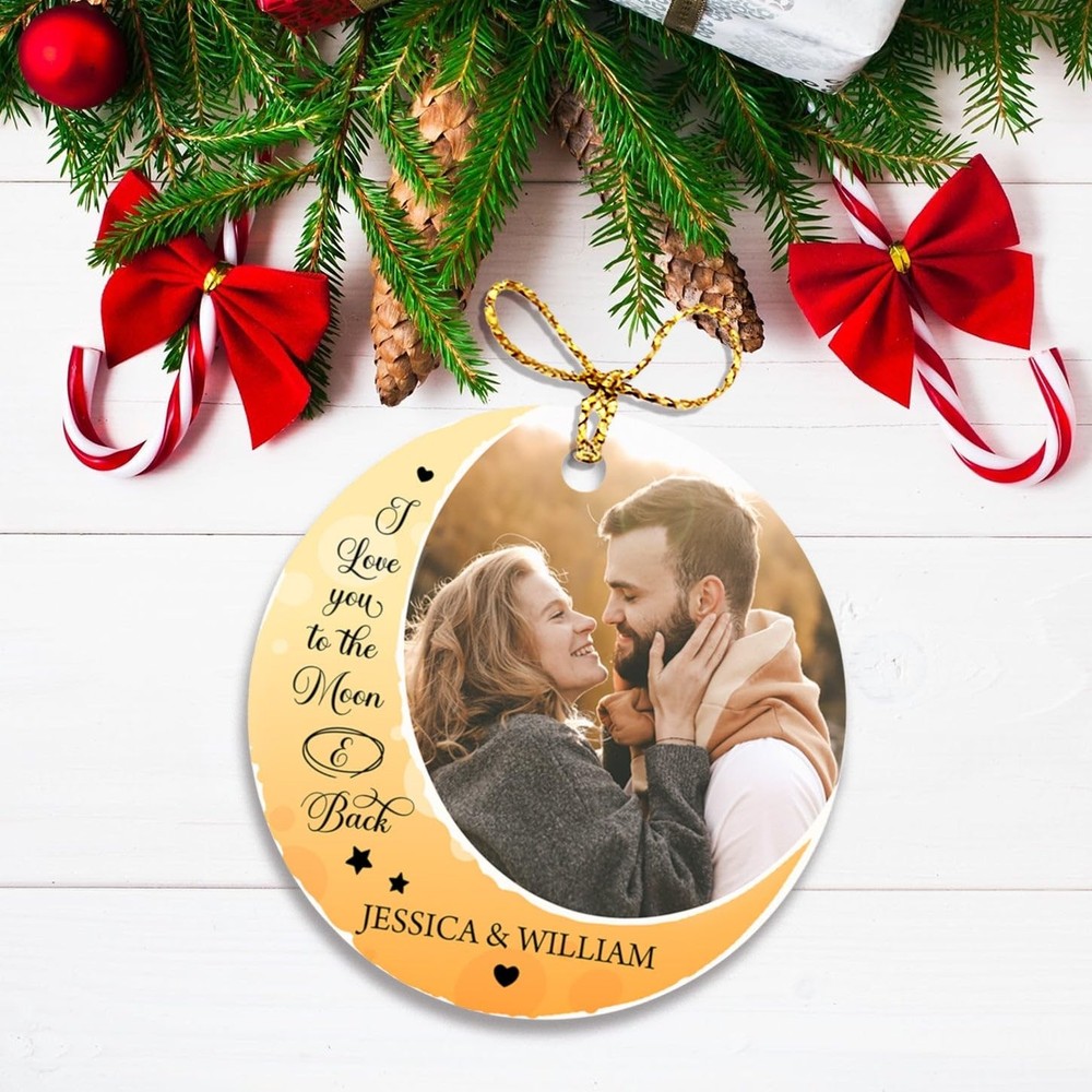 Personalized Photo Couple Christmas 2025 Ornaments, I Love You To The Moon And Back Ornament Christmas, Couple Dating Anniversary Photo Ornament Gift for Xmas 2024, Custom Picture Names Ornament Xmas ✔ PRODUCT DETAILS: Product Dimensions: 2.75” tall, 1/8 thick, 0.5 oz. Vibrantly printed from edge-to-edge on 1-side. Ships with a festive gold cord for easy hanging. Crafted from durable MDF with a high-gloss plastic finish so your designs last a lifetime. ✔ UNIQUE HOME DECOR PRESENT: Our ornaments make special gifts to commemorate lifetime firsts and momentous occasions. Great keepsake gift for Couples, Mr & Mrs, Newlyweds, Husband & Wife, spouses or any special person that you want to express your love. This beautiful ornament is not only for Christmas, but also as gifts for engagements, weddings, anniversaries or any other memorable day. ☛ Please do not hesitate to contact us any time if you have any problem with your order. Your satisfaction is our number one priority! PERSONALIZED X-MAX ORNAMENT: The most beautiful and special time of the year has come! Let's makes a great keepsake gift for Mr & Mrs, Newlywed, Couples, Friends, Women, Men, Husband, Wife...It's sure to become a beloved part of their holiday celebration. HIGH QUALITY: This customized Christmas ornaments was crafted from durable MDF with a high-gloss plastic finish so your designs last a lifetime. Single-sided print. Vibrantly printed from edge-to-edge via Sublimation. HOW TO CUSTOMIZE: Click "Customize Now" button, upload your photo, enter your text. Let's start to design your own beautiful ornament to commemorate the special day in your own home. SIZE: 2.75" tall, 1/8 thick, 0.5 oz. Each ornament includes a festive gold cord, which is easily to hang on the Christmas tree, window, fireplace, wall, or any place you want, making your home atmosphere more festive. SATISFACTION GUARANTEE: If you have any problem with your purchase, please contact us. We will respond to you within 24 hours. Your satisfaction is our ultimate goal.