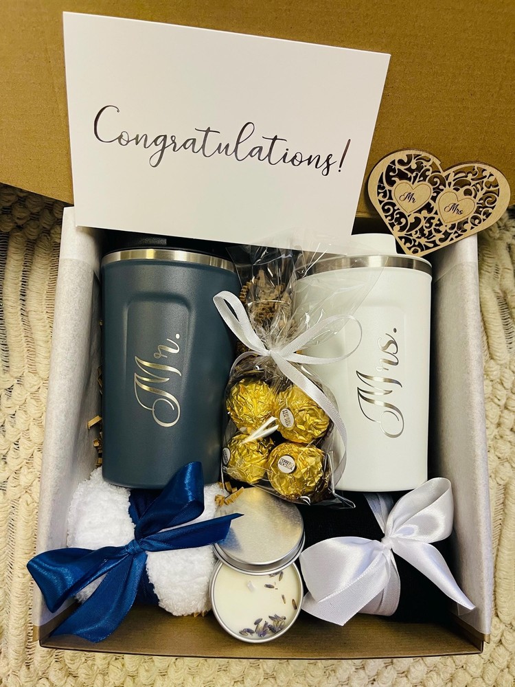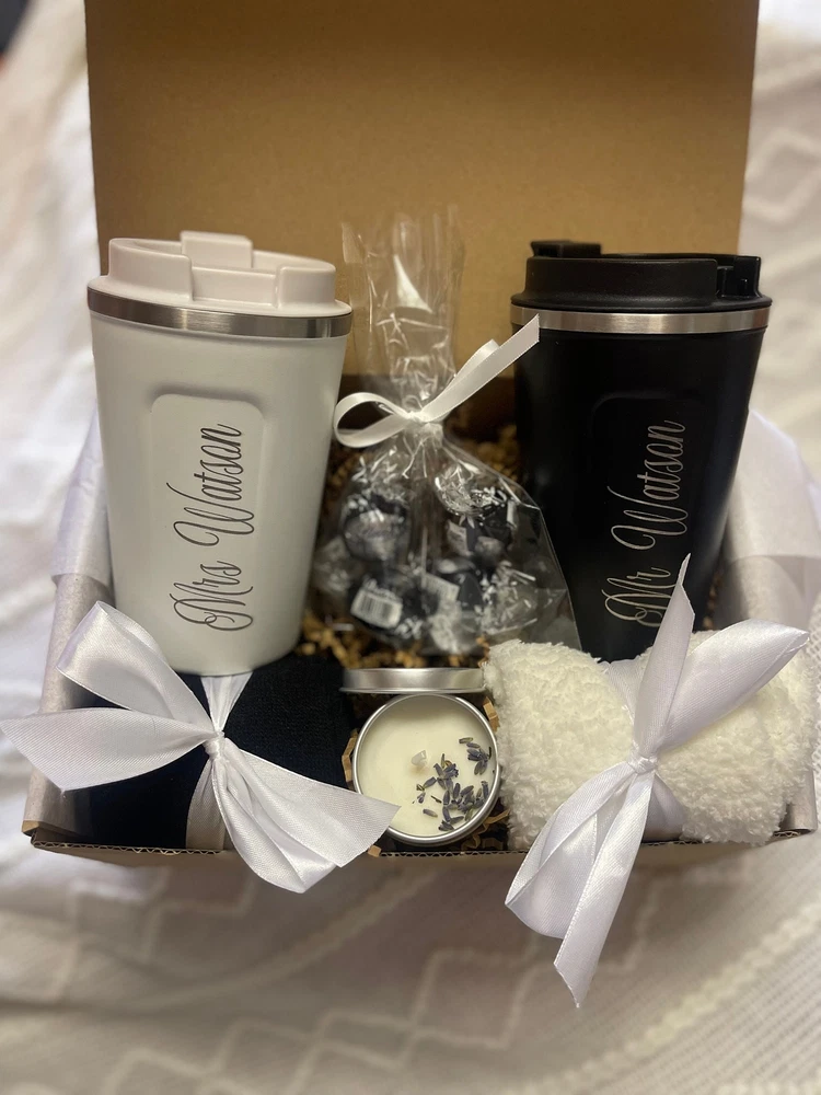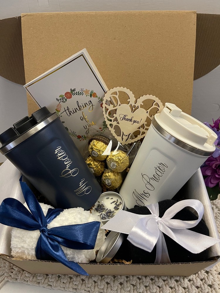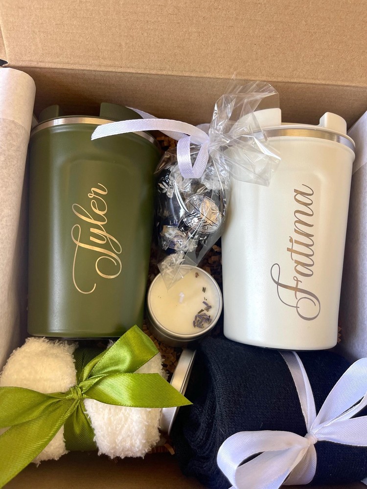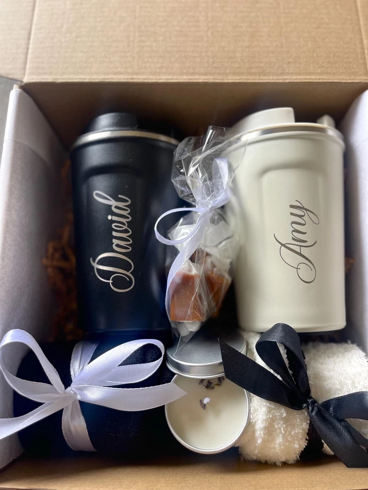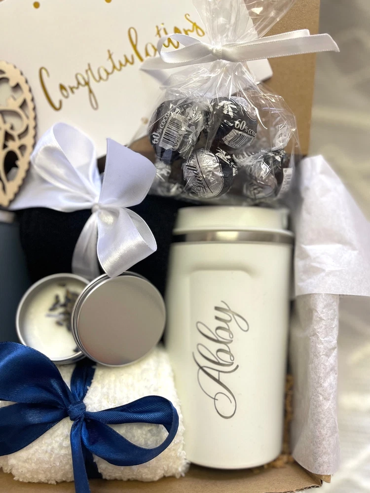 Ships from a small family business in California. 🖐Handmade. Dimensions: Height: 10 Inches; Length: 7 Inches; Width: 5 Inches Gift County Shop is an easy way to bring happiness to people you care about. We make every gift by hand with so much love and precision that your recipient will be feeling like this gift box was created directly by you! 🎁This gift box includes: -Stainless Steel Coffee Mug 12oz With A Cap - 2 pieces ( White&Blue or White&Black) ❗️ These are not vinyl, this is a permanent engraving! Can only engrave ONE side of the mug. The text is going to be silver. This can not be changed. -Men Soft Winter Fuzzy Socks PREMIUM QUALITY : 55% wool, 25% cotton, 15% polyester, 5% spandex.(One size 6-12) -Women White Soft Fuzzy Socks (One Size 5-9) -Ferrero Rocher Candies or Lindt Chocolate Candies - 4 pieces ( subject to stock availability) Or Metal Angel Bookmark With White Tassels -Handmade Candle (100% Natural Soy Wax, Natural Lavender Fragrance Oil) -A hand-written postcard with your wishes 💌Choose an occasion for which you're getting the gift box and we'll pick a card for you that fits the best! If you have a different occasion from what we have just let us know in the messages and we'll figure it out for you! Every gift box is handmade with love and care! You can be sure that your gift box will be safely delivered to your recipient and will definitely make her/him happier! ❗️Please note, if you are shipping this as a gift, please update the shipping address to where it should be sent. We will ship to the address you give at Etsy checkout. ‼️If an incorrect shipping address was given and the gift is returned back to our shop, the customer is responsible for paying the re-shipping fee. If you are unsatisfied with your order, just let us know and we will do everything to resolve the issue. ‼️In hot weather, chocolate candies will be replaced with sea salted caramels‼️ NOTICE: The images we provided are very close to the actual product. Colors of the actual product may vary when viewing from different devices, such as computer screens (resolution issues), cellphones, tablets, or many others. Attention: We are not responsible if the address you've entered is incorrect. If the gift box is returned to us due to incorrect address of the recipient, the second delivery is on the customer. If there's no personalization on the tumbler/mug or on the greeting card when the order is placed, they will be left as blank unless we have previously discussed it.