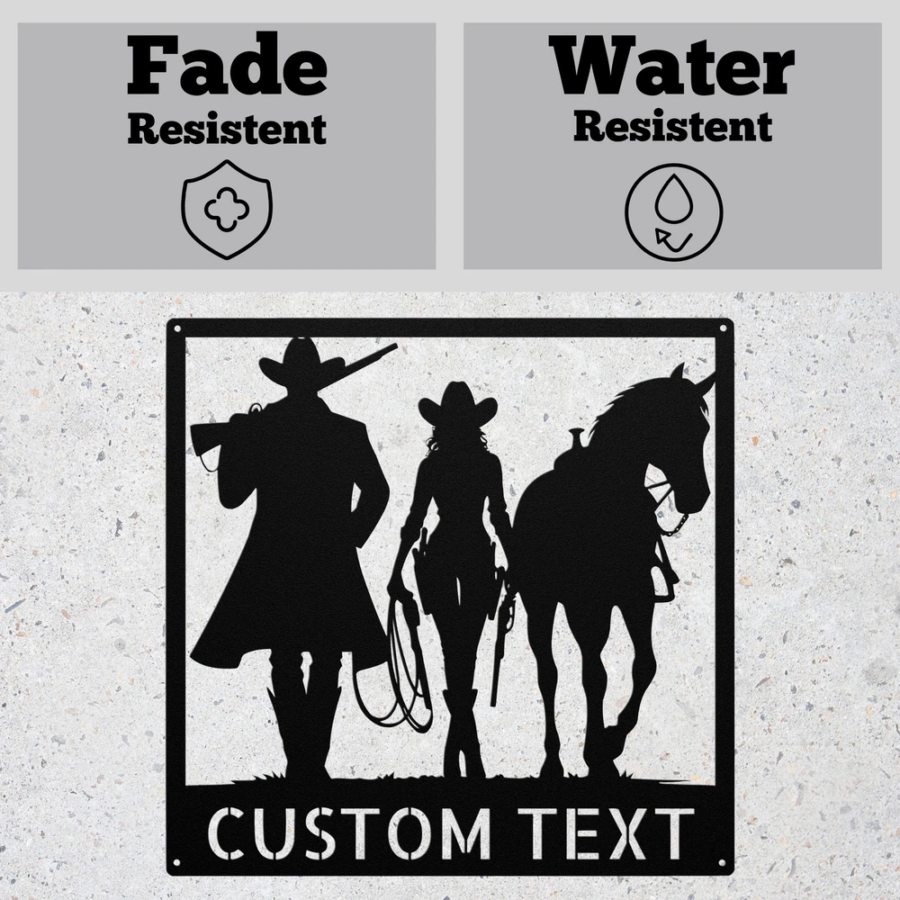 Product Description Personalized Cowboy Cowgirl with Horse Metal Sign Custom Wall Art Decor Gift Add a touch of western charm to your space with our Personalized Cowboy Cowgirl with Horse Metal Sign ! This custom wall art decor is perfect for horse lovers and those who embrace the cowboy lifestyle. Made from high-quality 16-gauge metal, this sign features a durable powder coating that protects it from dust, weather, and water, ensuring it looks great both indoors and outdoors. Looking for the perfect gift? This personalized metal sign makes an excellent choice for Christmas, birthdays, or any special occasion. It’s a unique way to celebrate the bond between cowboys, cowgirls, and their horses. Key Features: Customizable Design : Personalize the sign with a name or special message. Durable Material : Crafted from 16-gauge high-quality metal for long-lasting use. Weather-Resistant : Powder-coated finish protects against dust, rain, and rust. Versatile Decor : Ideal for both indoor and outdoor display. Great Gift Idea : A thoughtful present for any cowboy or cowgirl. Show off your love for the cowboy lifestyle or surprise a friend with this beautiful metal sign. Order yours today and add a personal touch to your decor! Service and Color Choice Our metal signs are designed to be personalized just for you, making them the perfect addition to any space! The default color for our signs is Black , but we also offer a variety of beautiful options including Copper, Gold, White, and Silver . After placing your order, simply contact us with your preferred color choice, and we'll ensure your sign is exactly how you envision it. Let’s create something special together!