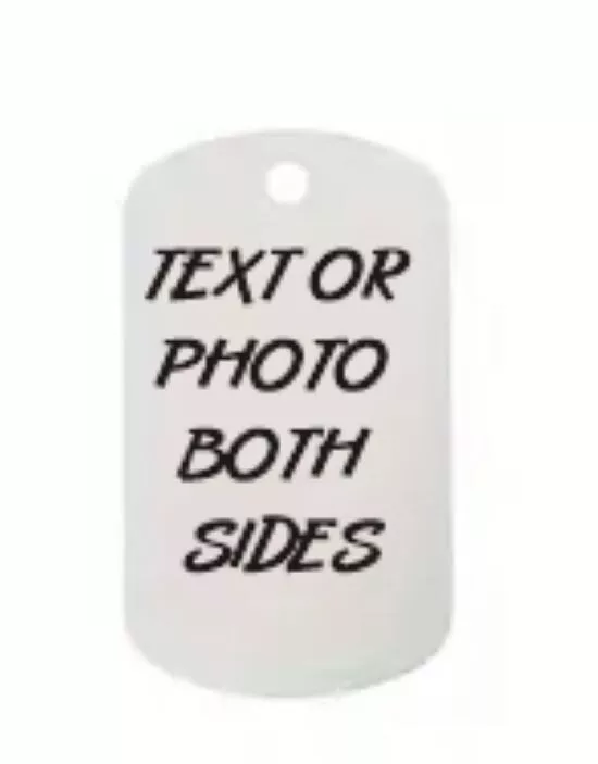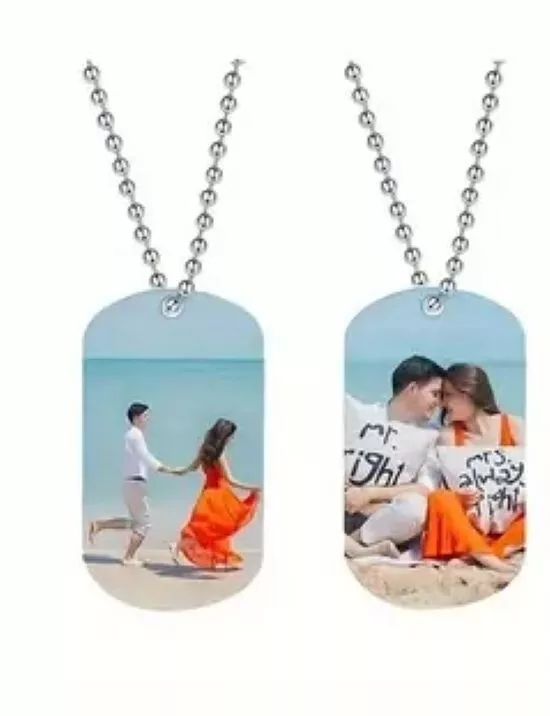 This personalized custom photo dog tag necklace features a rectangular pendant made of silver stainless steel, with a length of 23.5 inches. The necklace can be customized with a photo or text of your choice, making it a unique and thoughtful gift. The pendant is reversible and adjustable, allowing for versatile styling options. Simply provide the desired personalization details in the "contact seller" section when placing your order. The chain can be shortened providing length of your choice, as shown in 1 of the pictures for a double set of dog tag photos.