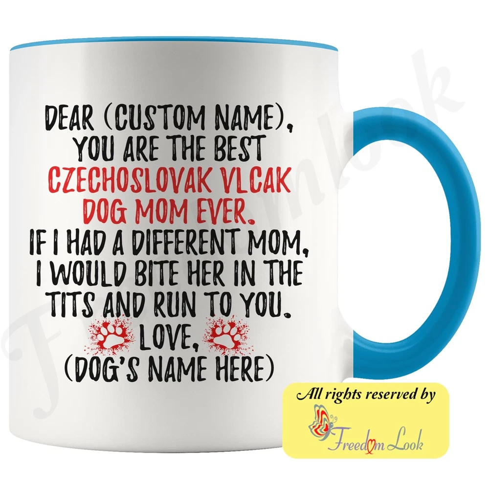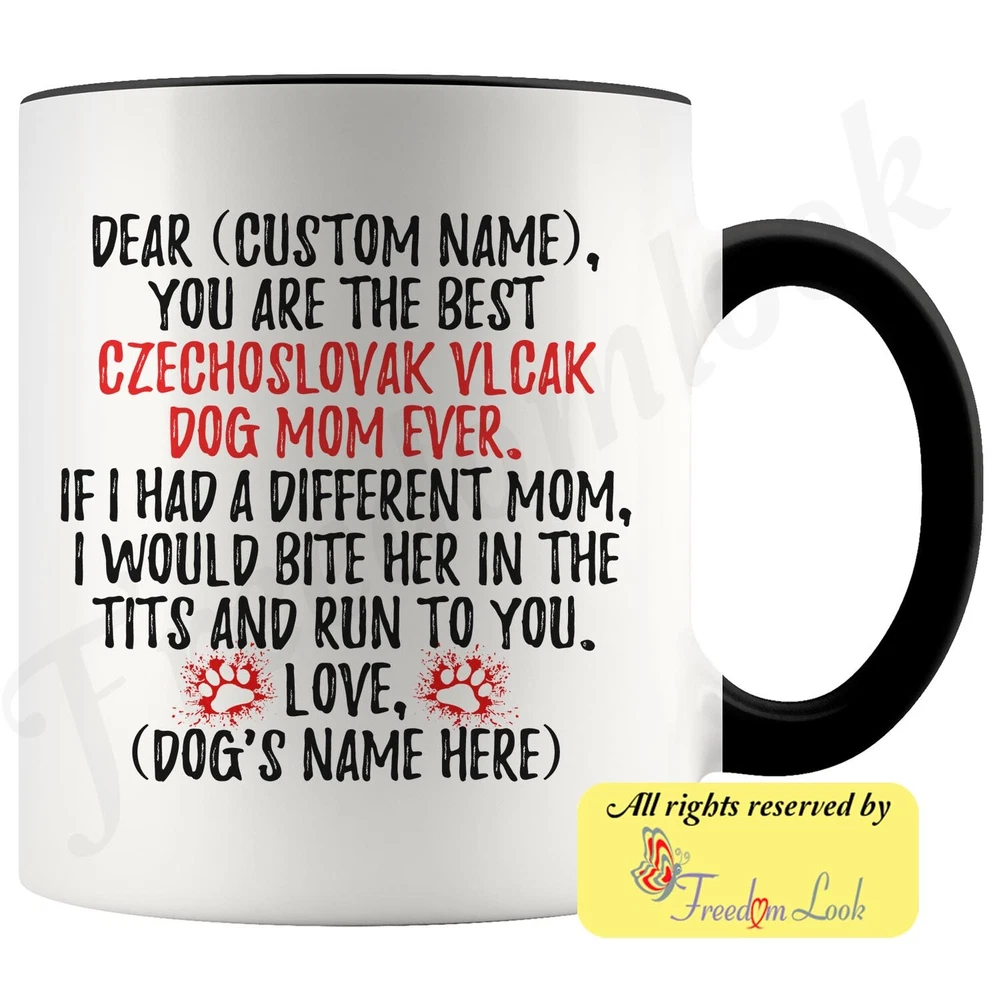 personalized czechoslovakian vlcak dog mug, czechoslovakian wolfdog coffee mug, slovak wolfdog gifts, czech wolfdog mom present gift, ceskoslovensky vlcak mommy mug, czechoslovakian vlcak dog owner mug, i love dogs, custom czech & slovak wolfdog gifts, dog coffee cup, mothers day gift Are you looking for a great, unique and personalized gift for a dog owner? Search no more and get this mug TODAY. They will be thankful forever. Don't miss it because you'll regret it later by not getting it. This is the perfect coffee mug with content "DEAR 'CUSTOM NAME', YOU ARE THE BEST CZECHOSLOVAKIAN VLCAK DOG MOM EVER. IF I HAD A DIFFERENT MOM, I WOULD BITE HER IN THE TITS AND RUN TO YOU. LOVE, 'DOG'S NAME HERE' ". CUSTOM MOM'S NAME AND DOG'S NAME Please put the mom's and dog's name in the notes at the checkout or just send us a message. By not doing this, it will delay your order. Example: Mom's name: Emma; Dog's name: Charlie A PERFECT FUNNY GIFT FOR A CZECHOSLOVAKIAN VLCAK DOG MOM! This special coffee cup can be a great gift for every Czechoslovakian Vlcak mom. Sizes: Colored coffee mug size: 11 oz White coffee mug size: 11 oz or 15 oz DISHWASHER AND MICROWAVE SAFE! This version of ceramic mug shows it's true colors with quality assurance to withstand heat in the microwave and put it in the dishwasher as many times as you like, the quality will not be Altered. THE MUG DESIGN IS PRINTED ON BOTH SIDES! No matter if you hold your teacup in your right or left hand, you and everyone else will be able to see this unique design. Looking at this cute coffee mug will put a smile on everyone's face! We want you to be 100% satisfied, so please let us know if there is anything wrong with your order so we can fix it right away. We truly offer the most stunning, unique and trendy highest-quality products in the world. All of our products are custom-made-to-order and handcrafted to the highest quality standards. We stand by our products the quality is outstanding rest assured. Triple check your address , we copy addresses exactly as written, any undeliverable orders due to customer error are not our responsibility. Mug for every day. Christmas birthday brother sister mom mother father dad aunt grandma grandpa girlfriend gift